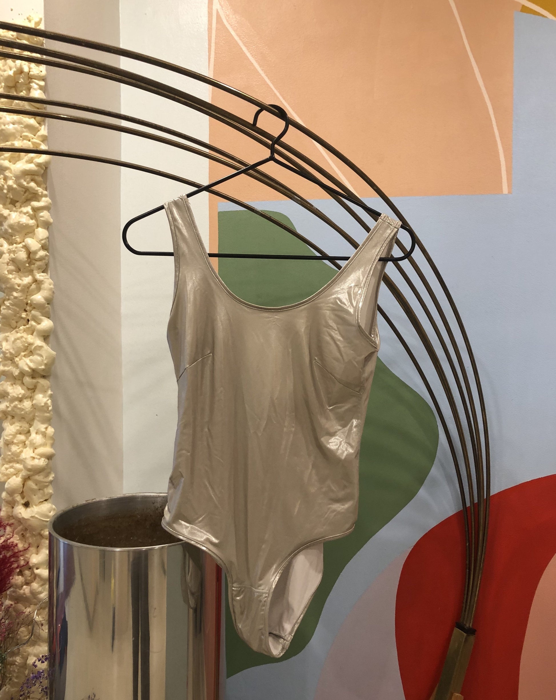 Bodysuit with a scoop neck, a low back and high cut leg. Usable for swimming, sea and chore water resistant.
