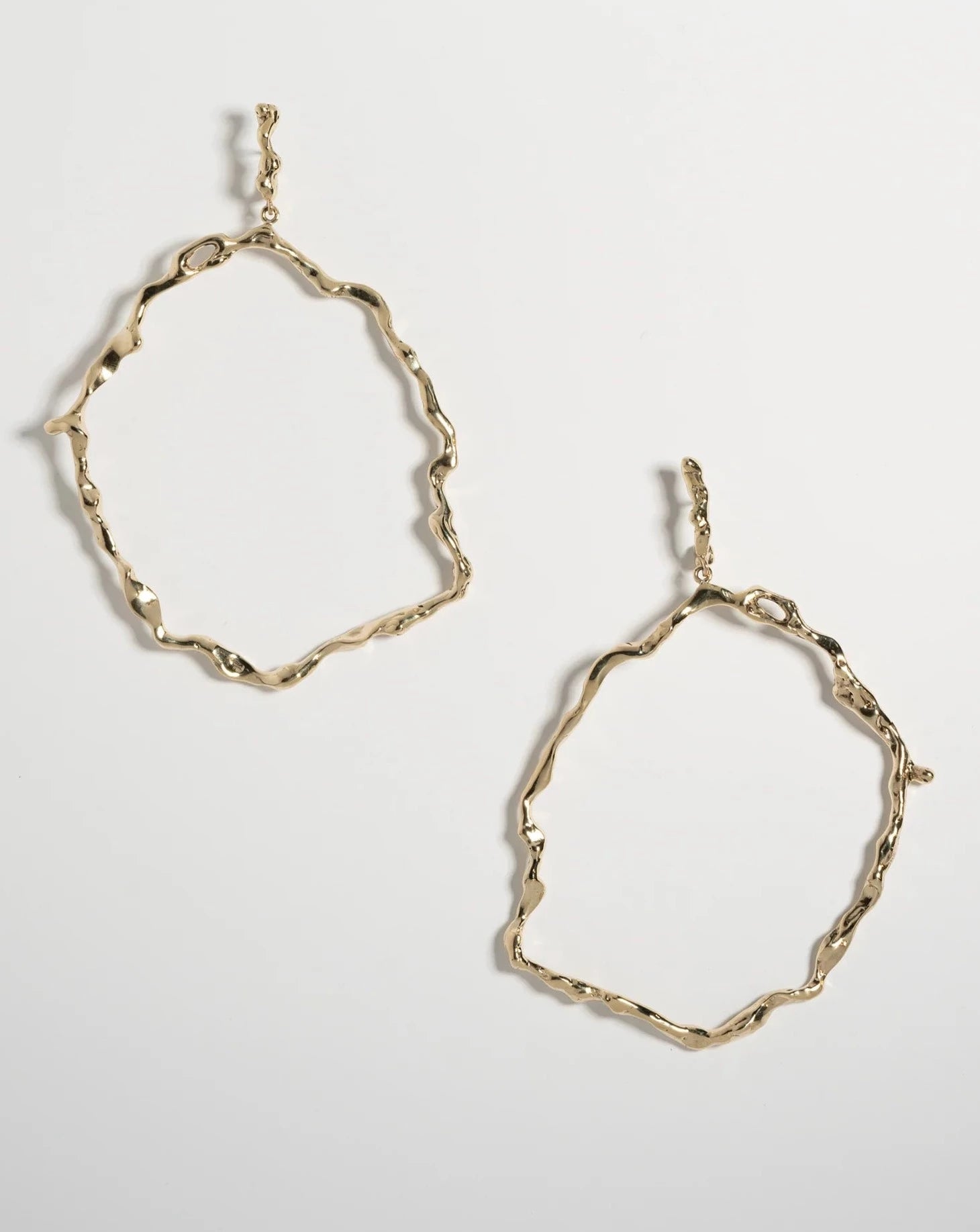 Dramatic, playful hoops that drip with texture and sway with oversized dimension, brushing the shoulders. The thoughtfully placed hinge curves just beneath the lobe.