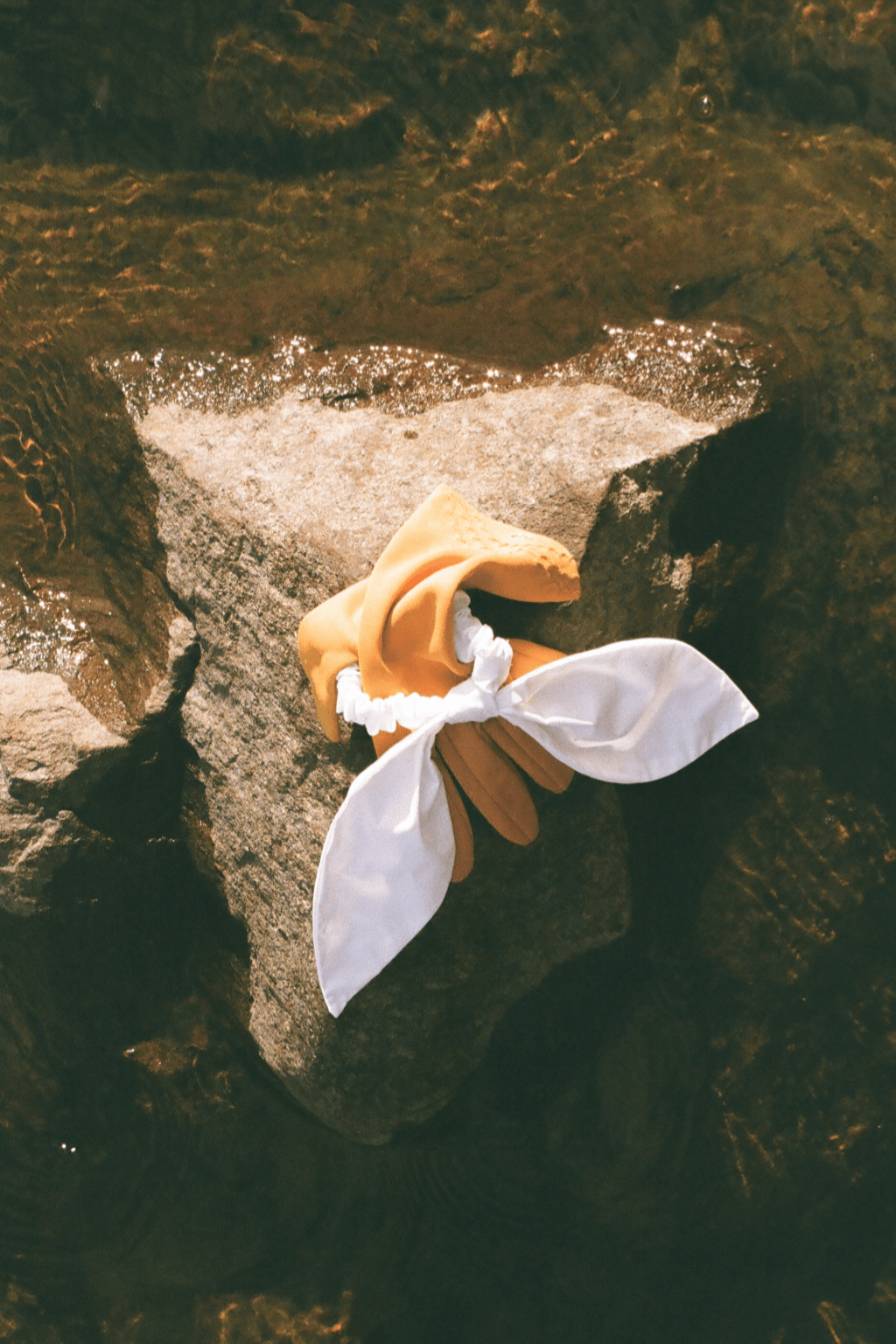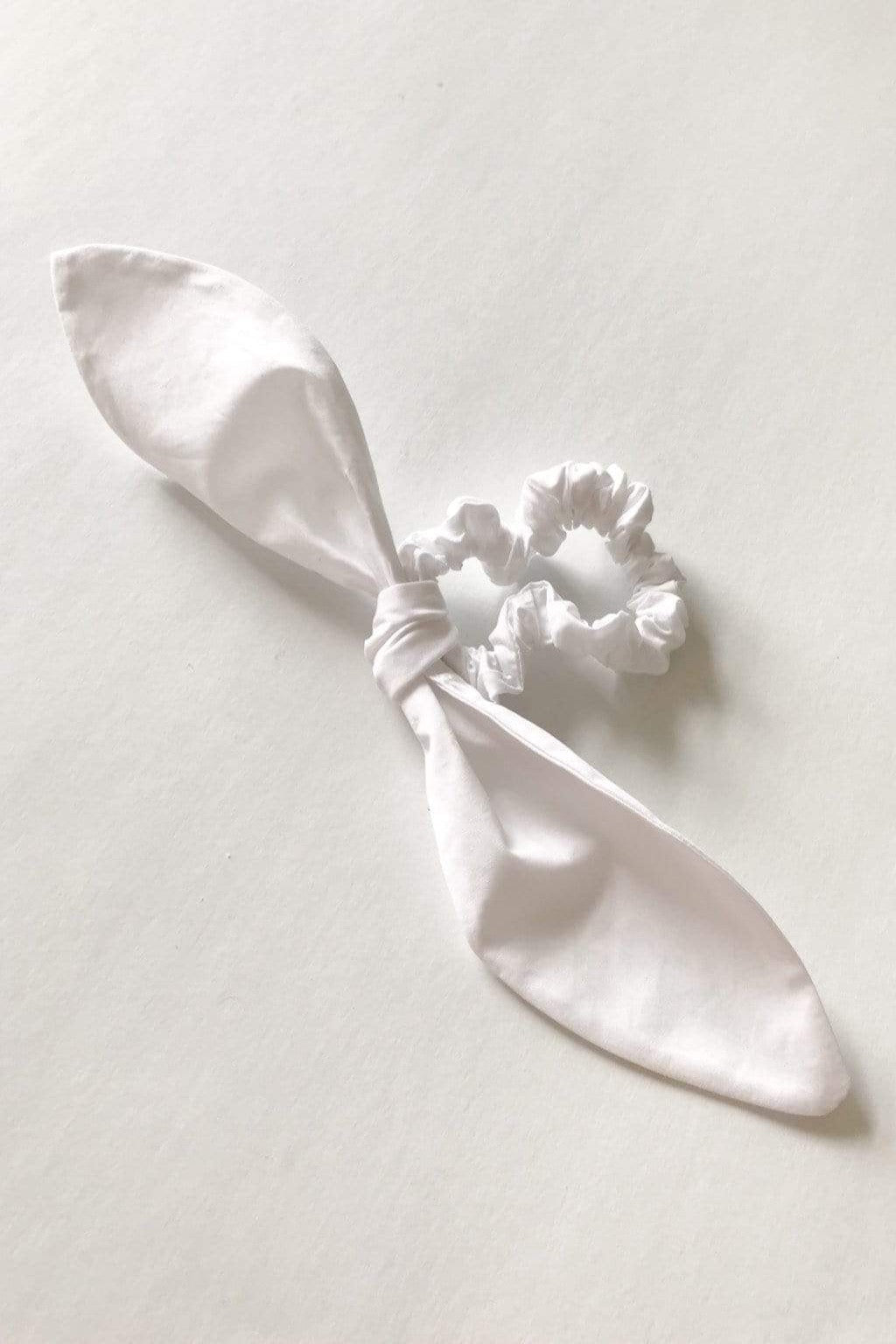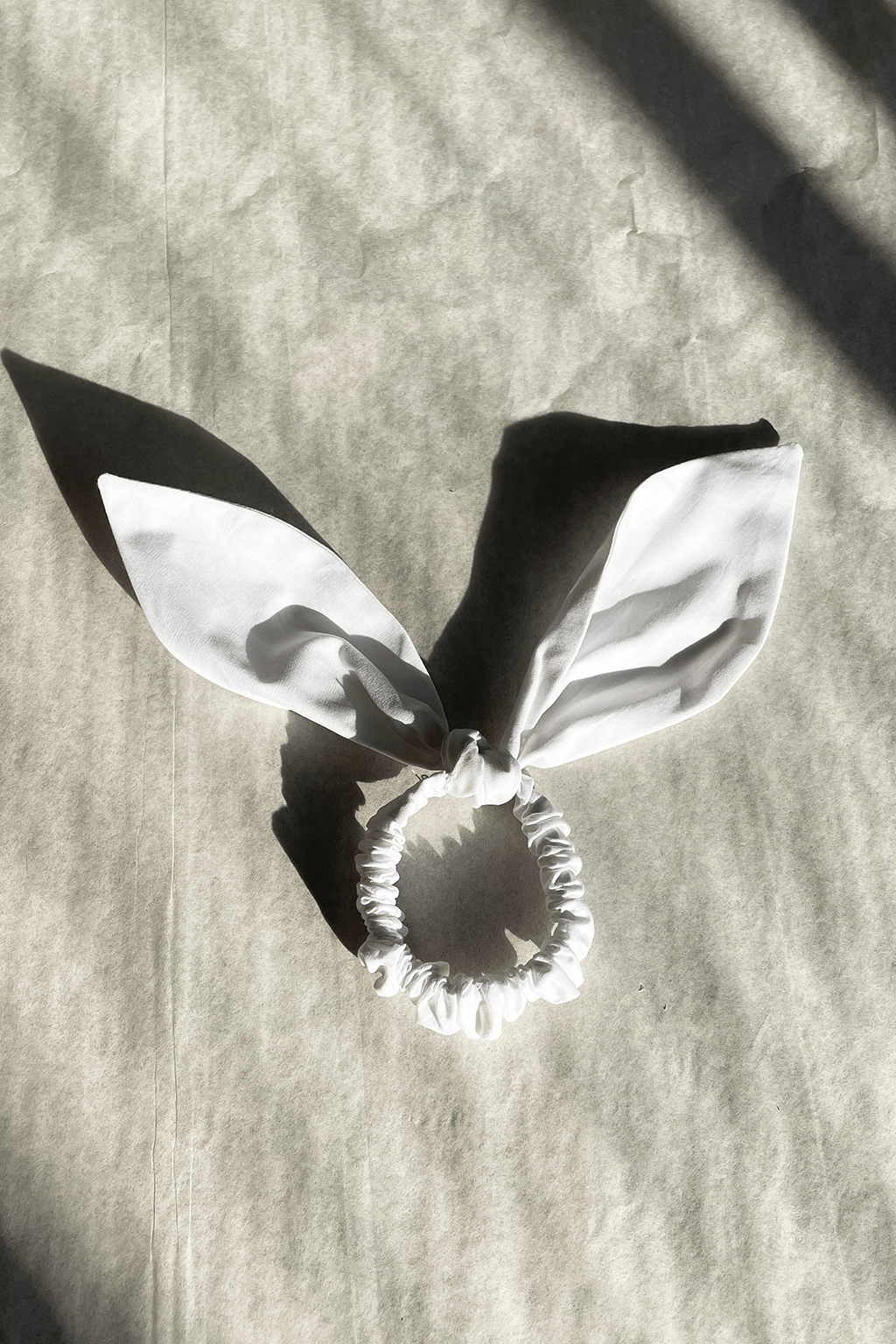 A classic scrunchie, made from leftover fabric scraps, with a removable bow-tie.
