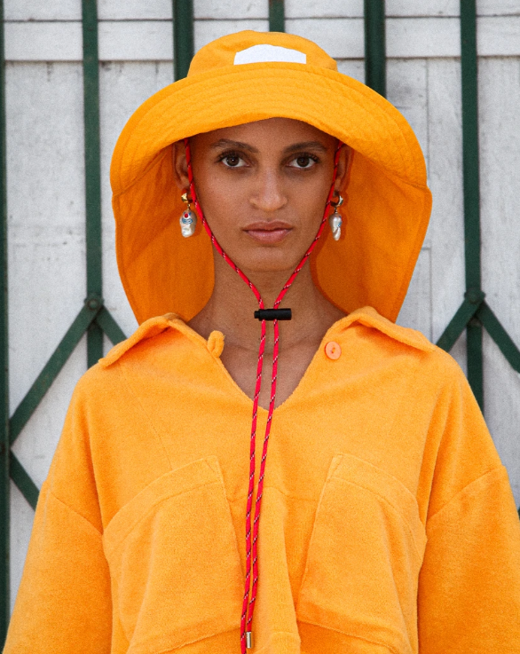Funky and floppy bucket hat with an asymmetrical brim and contrast colour draw string.