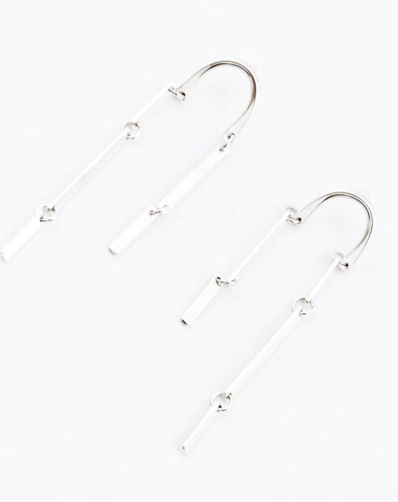 dangling earrings made from silver tapered connected links hanging from a hammered arch, varying lengths on either side. silver stud posts and backs.