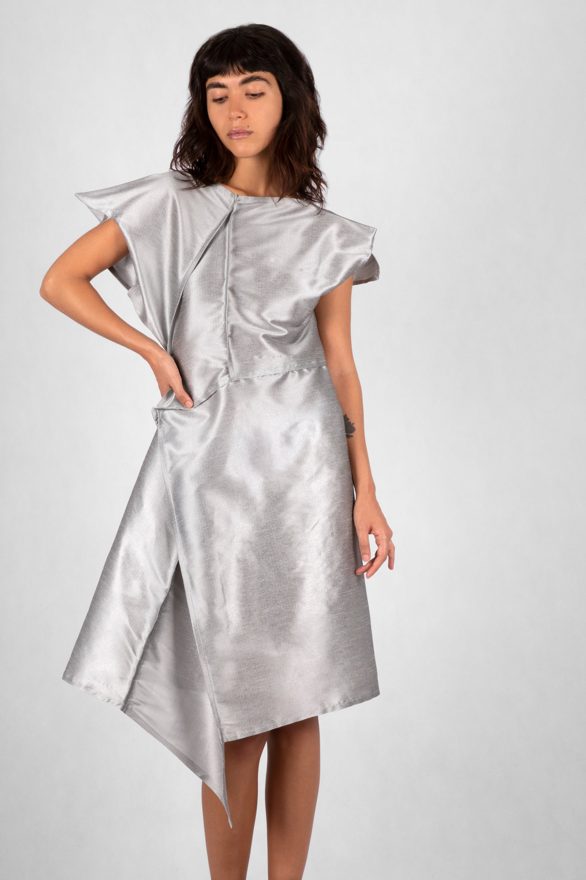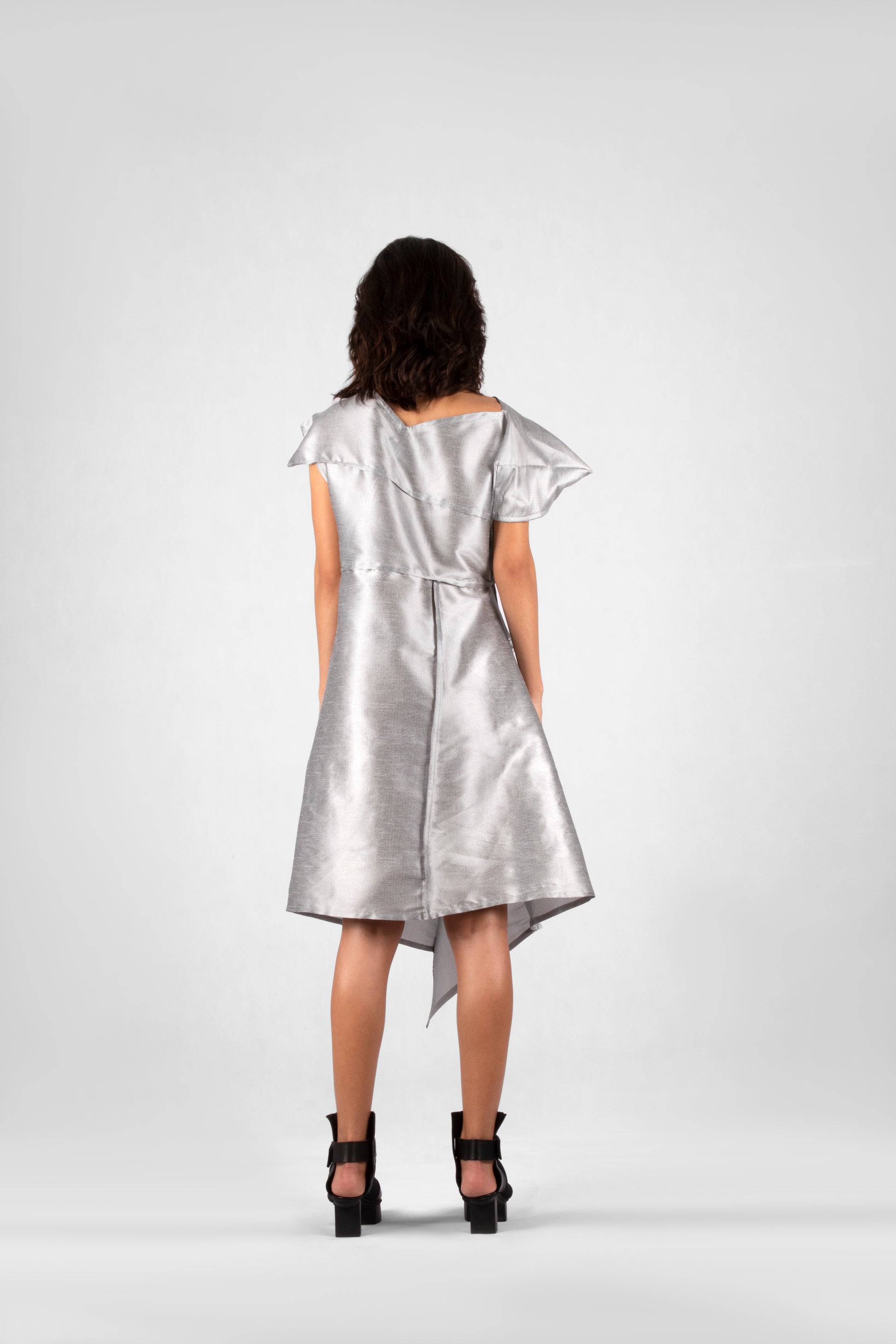 The Celestial taffeta Dress embodies an ethereal, cosmic energy with its sleek, silver sheen and angular form. Featuring an asymmetrical cut and structured folds, this piece evokes a sense of fluidity and transformation. The luxurious fabric catches the light, offering a modern, futuristic aesthetic with a nod to timeless elegance. A unique fusion of drama and sophistication, this dress captures the balance between structure and movement, making it an unforgettable addition to any wardrobe. Ideal for the forward-thinking individual who values artistic expression and innovative design.