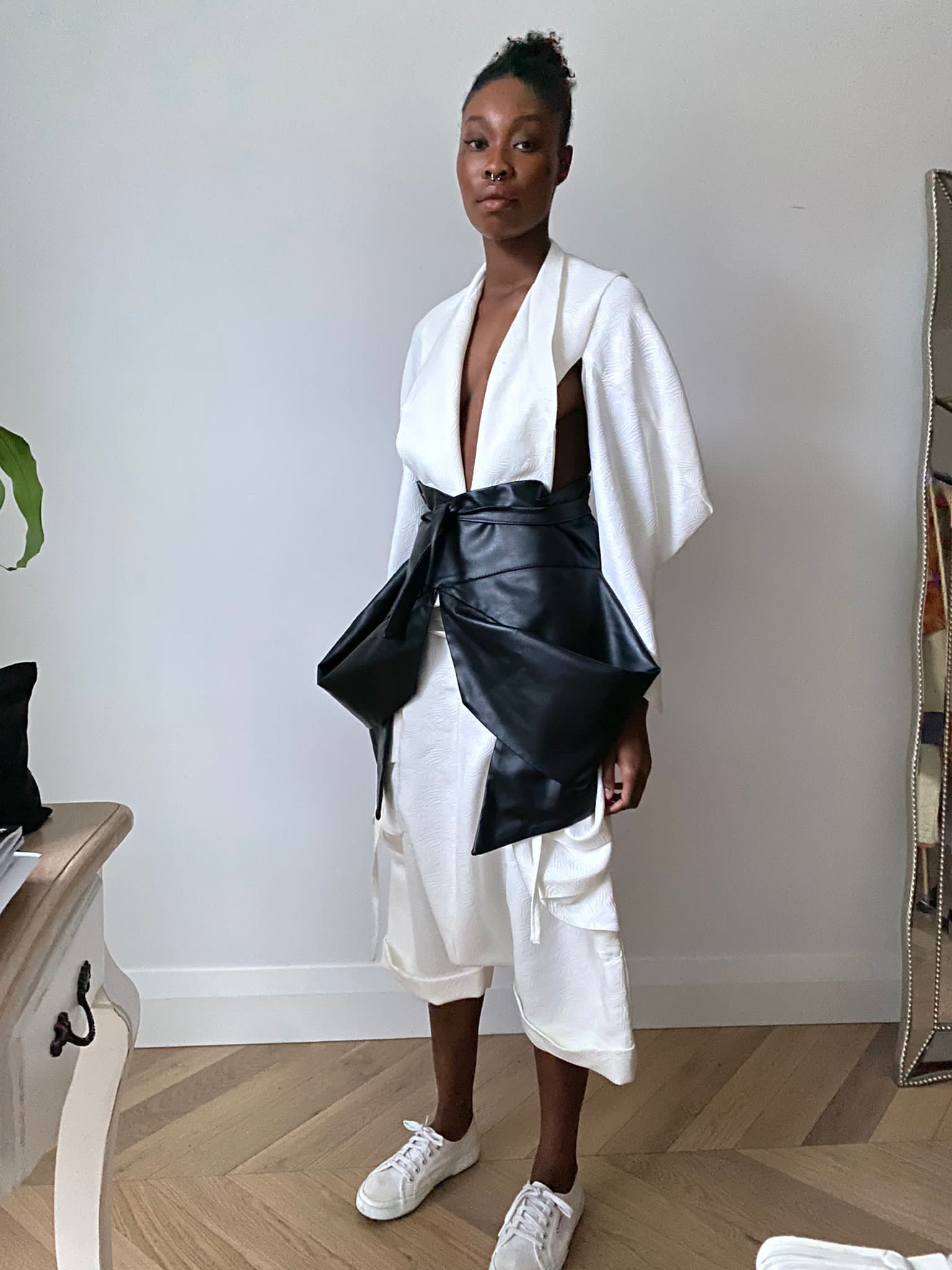 A versatile and adaptable piece, the Belt offers the flexibility to be styled in multiple ways. Whether wrapped around the waist for a tailored, cinched look or tied as a cropped statement piece, this accessory adds structure and flair to any outfit. Crafted from soft, structured fabric, it allows the wearer to create a personalized fit and design, making it a must-have for those who love to experiment with fashion.