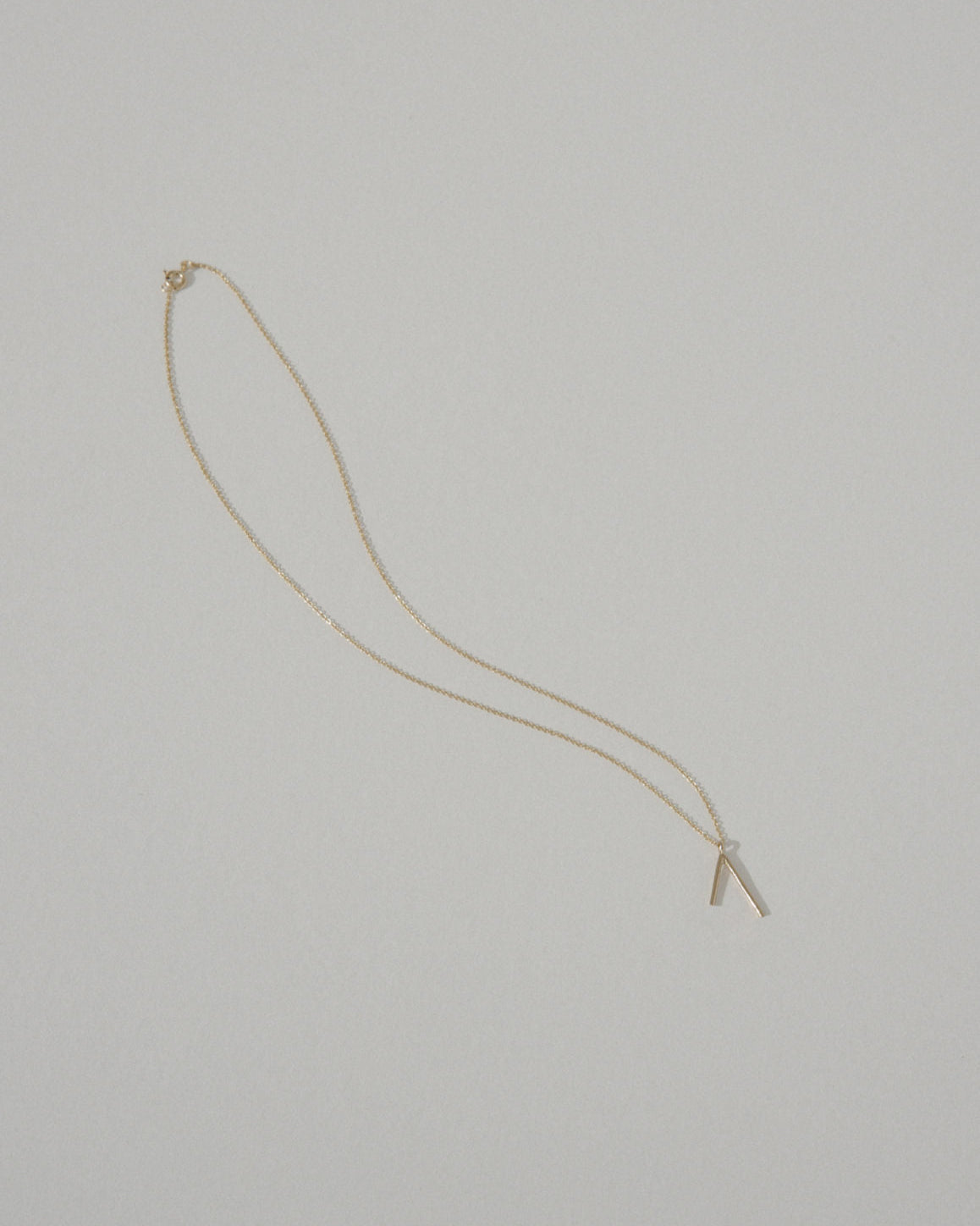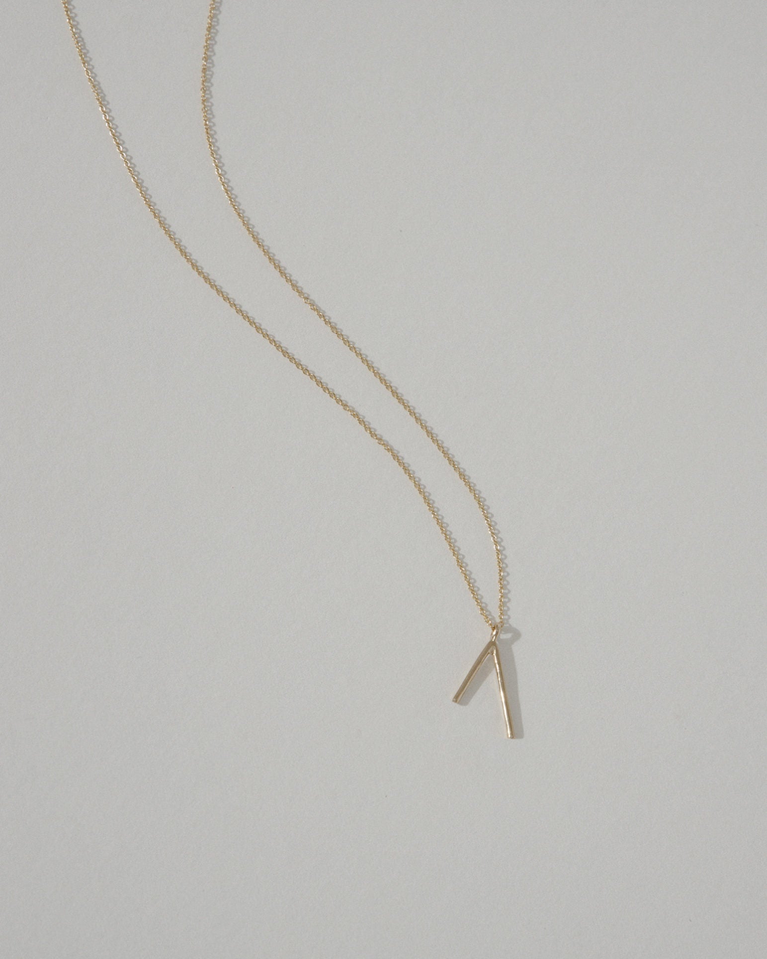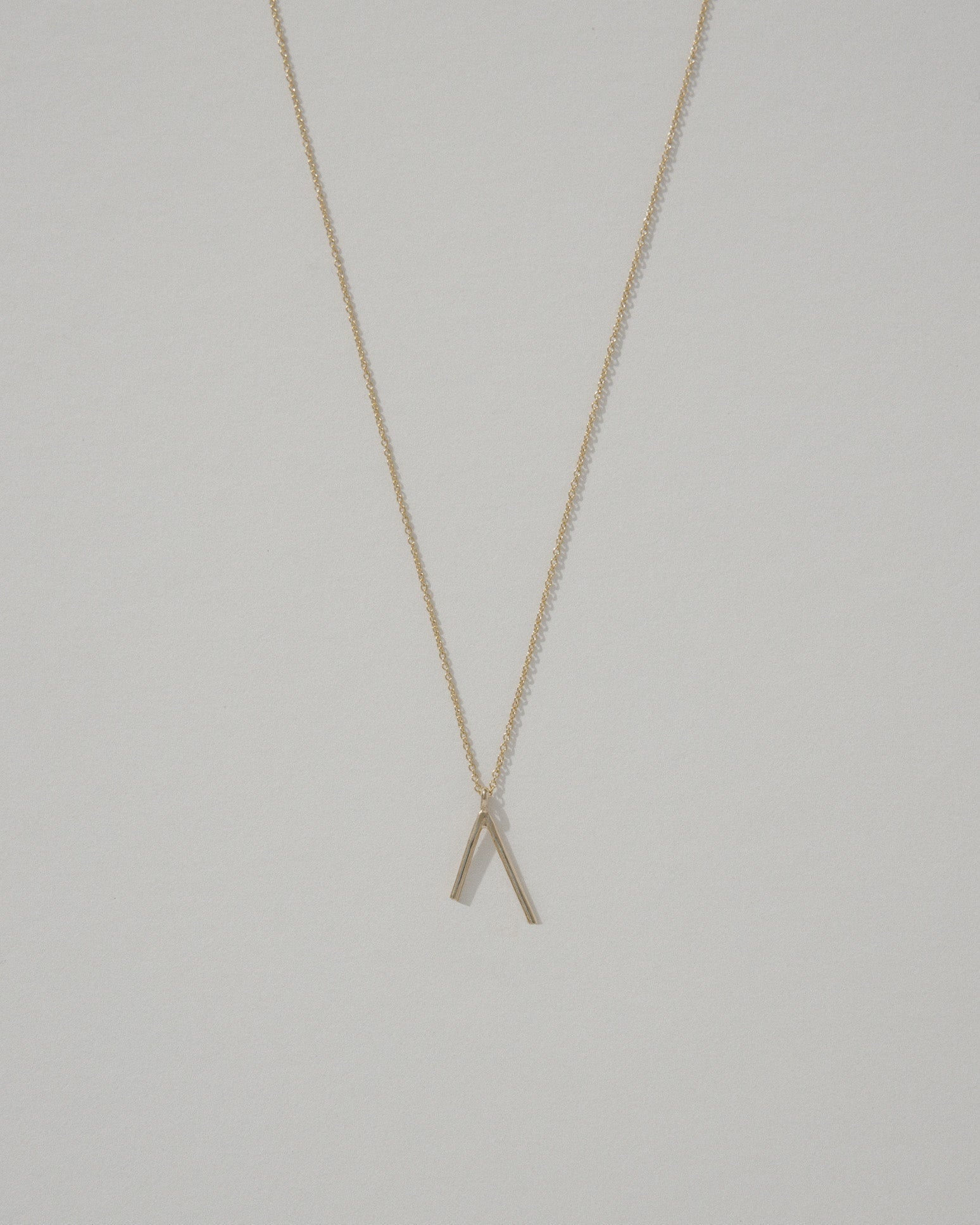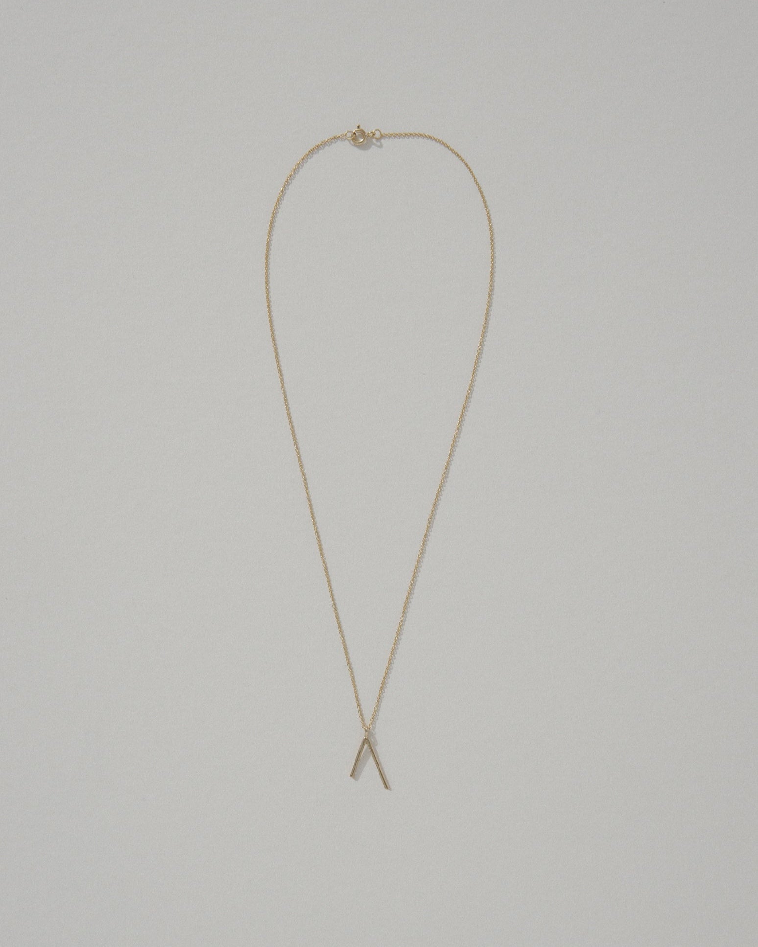 Another Feather's signature dart pendant with asymmetrical sides on a delicate 18″, solid 14k gold chain. Perfect for simple, everyday adornment.