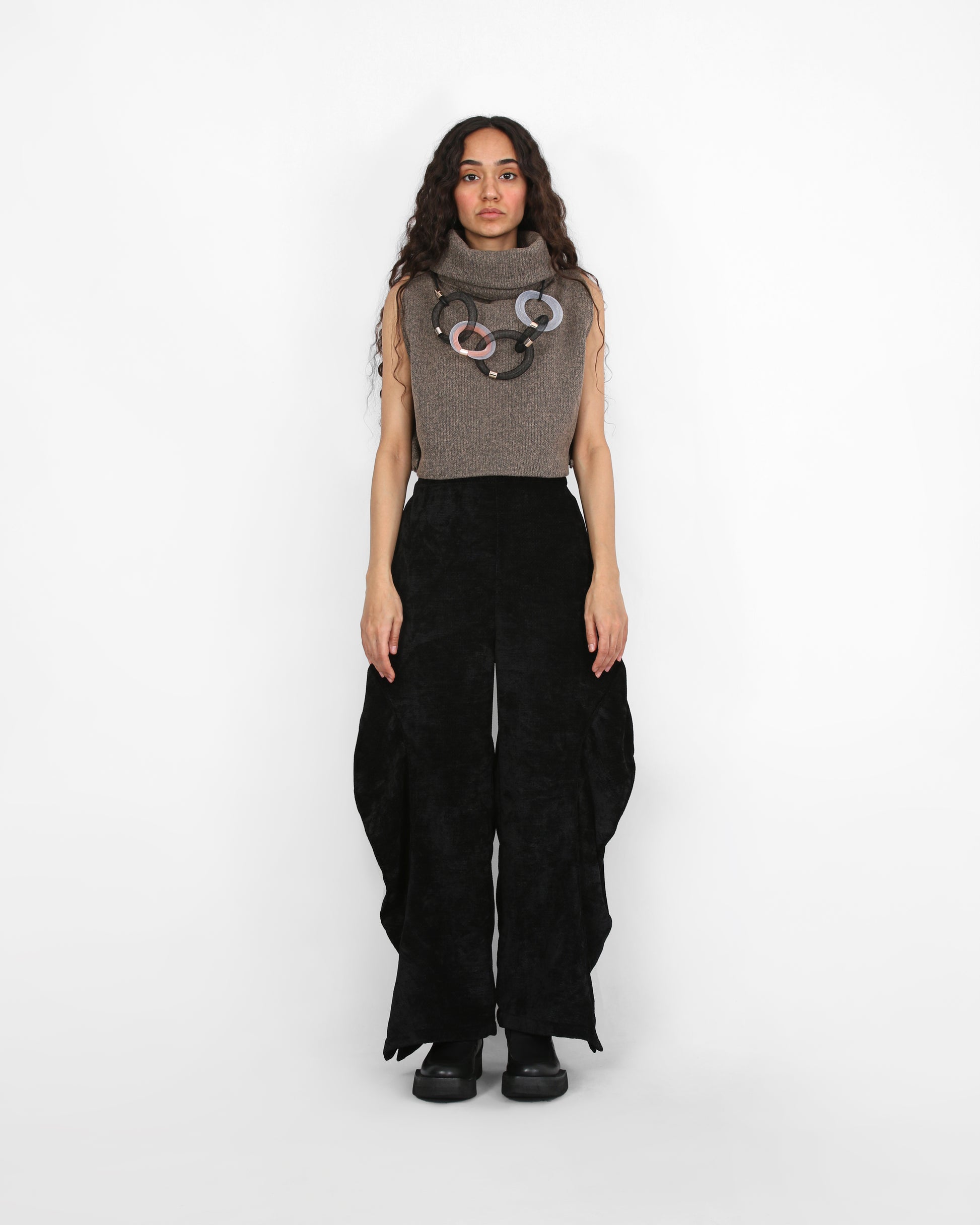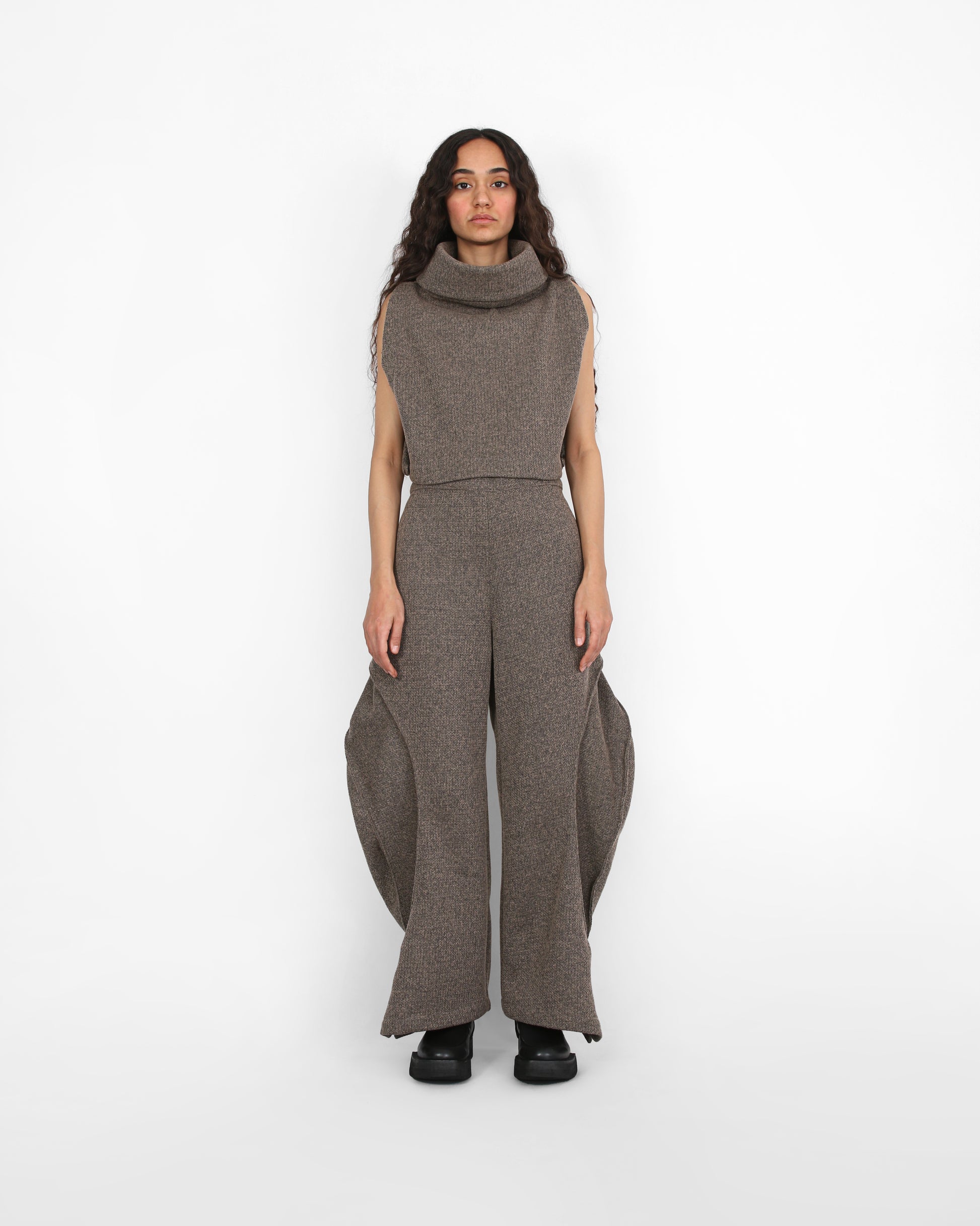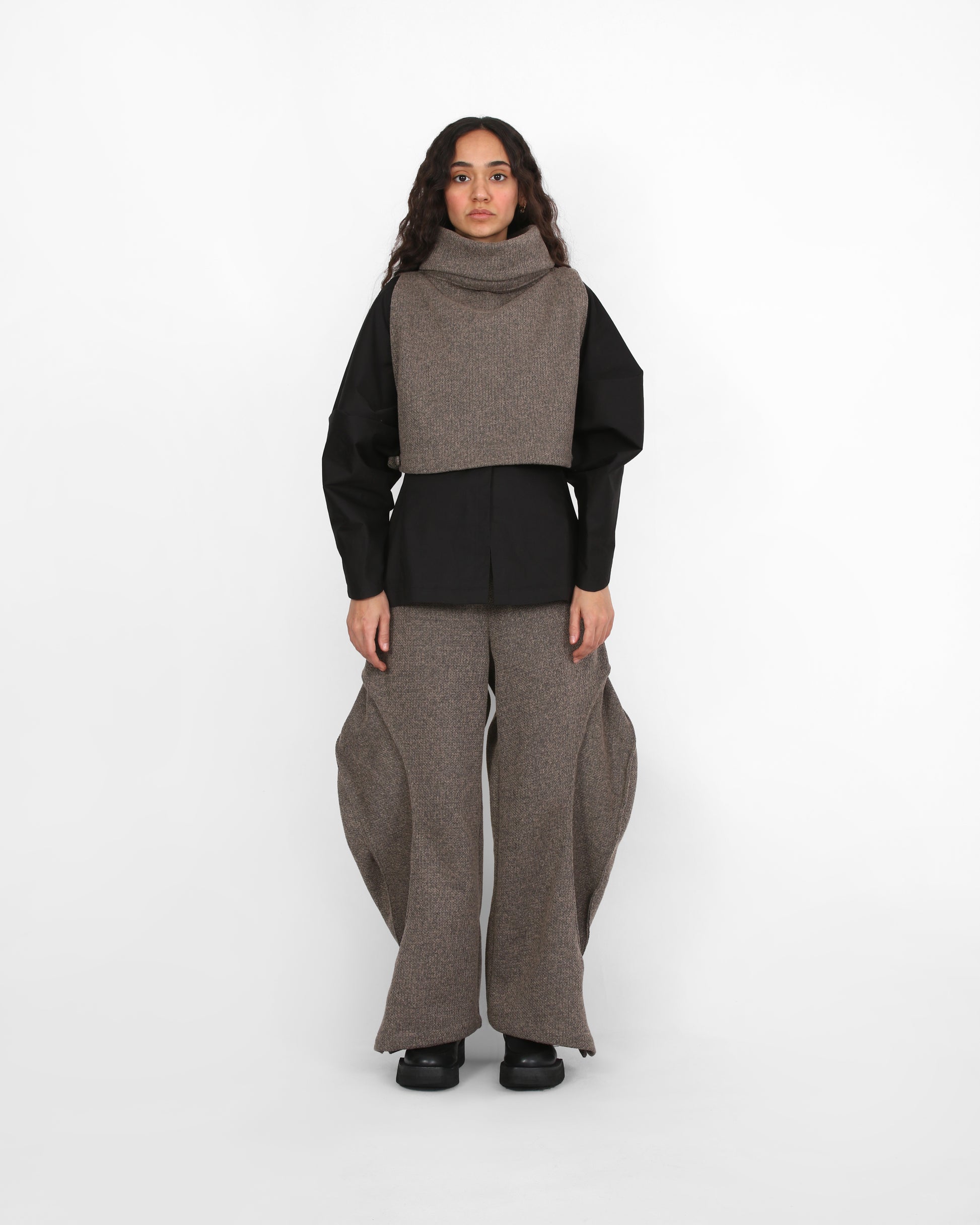 This sleeveless top/vest is defined by its dramatic cowl neck, creating a flowing yet structured silhouette. Made from textured wool, it offers a perfect balance of elegance and comfort, making it a versatile piece for layering or wearing on its own. it has bbottoms at the sides for a better fit