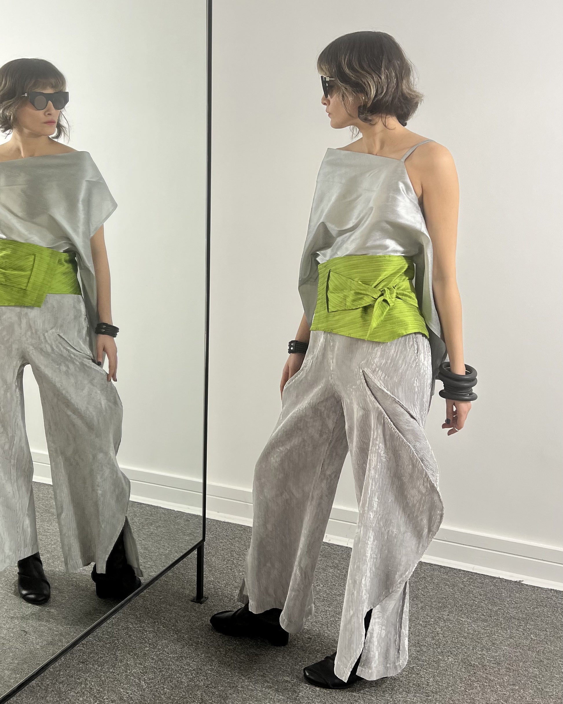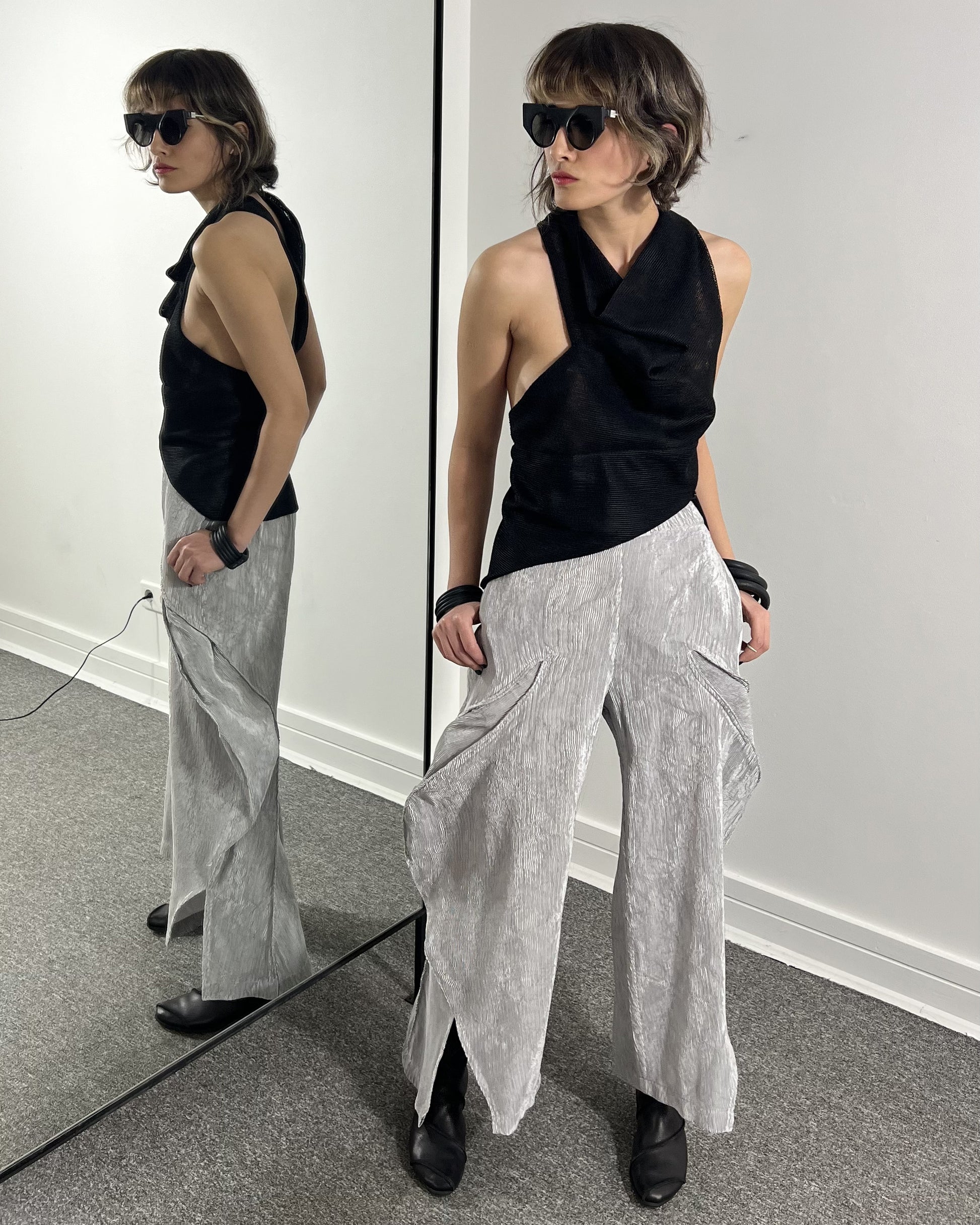 The Enigma Pants are a striking fusion of form and function, designed to challenge conventional silhouettes. The pants feature intricate mesh detailing along the sides, creating an alluring play of transparency and structure. The fluid, relaxed fit is contrasted by the sharp, geometric angles at the waist and hem, giving the piece an avant-garde yet wearable quality. With their bold statement-making design, these pants capture the essence of modern minimalism while offering an unexpected twist, making them a must-have for the fashion-forward.