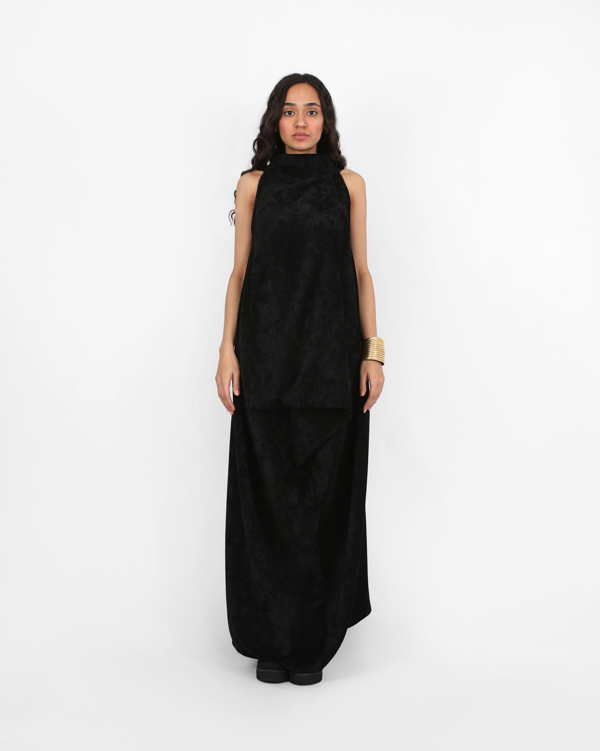 Experience bold design and timeless elegance with the fluid geometry Dress. This sleeveless dress boasts a high, sculpted neckline and layered asymmetrical draping that creates a dynamic flow. it exudes confidence and sophistication, perfect for formal events or artistic expressions.
