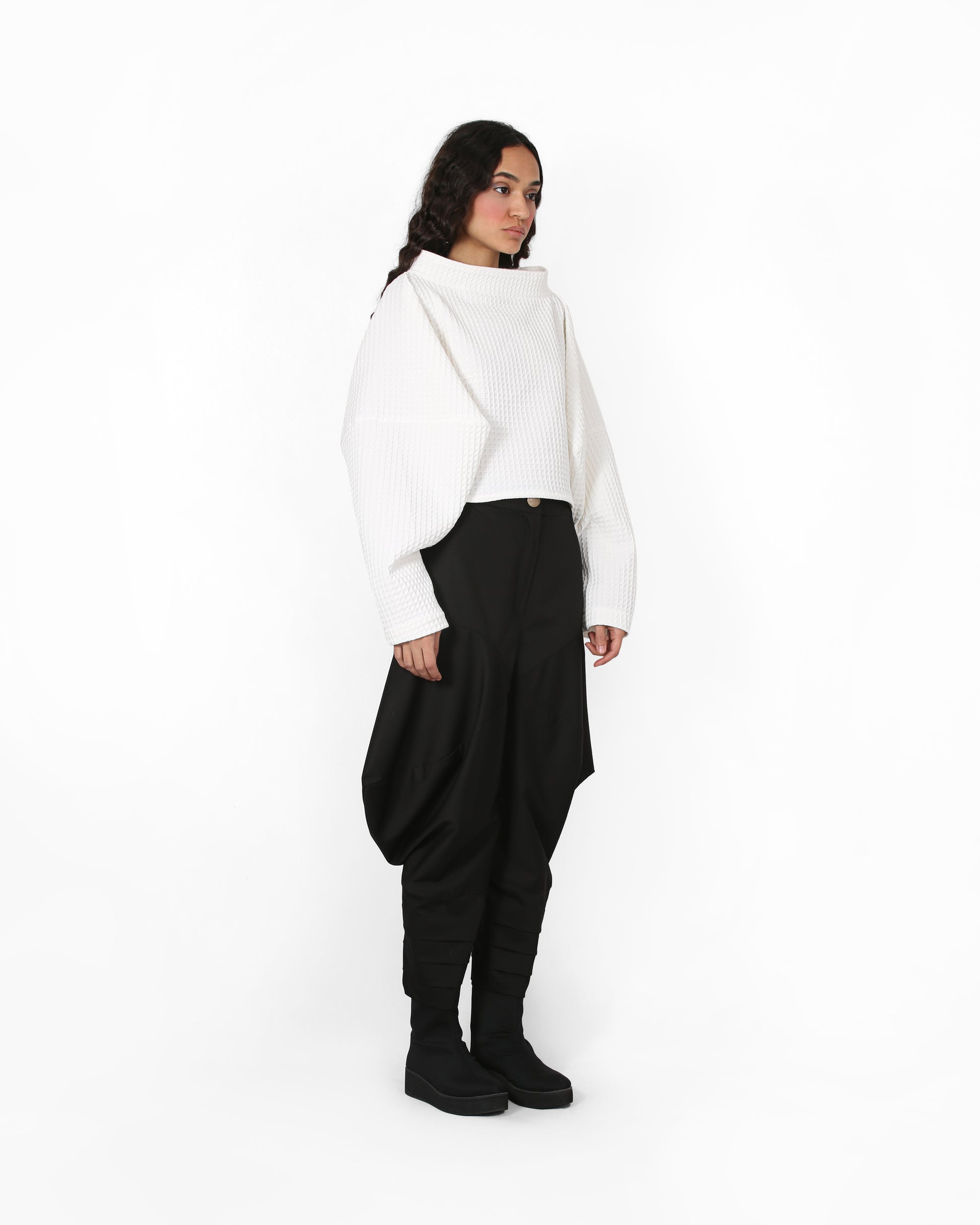 With innovative pattern-making that creates volume, the design twists and spirals around the body, giving a dynamic sense of movement. The sculptural folds and pleats add depth and dimension, turning the pants into a piece that evolves with each step. The design reflects a perfect balance of sharp, geometric lines and organic fluidity, making it a statement piece for those seeking to merge boldness with elegance. Perfect for the modern individual, these pants embody both artistry and practicality.
