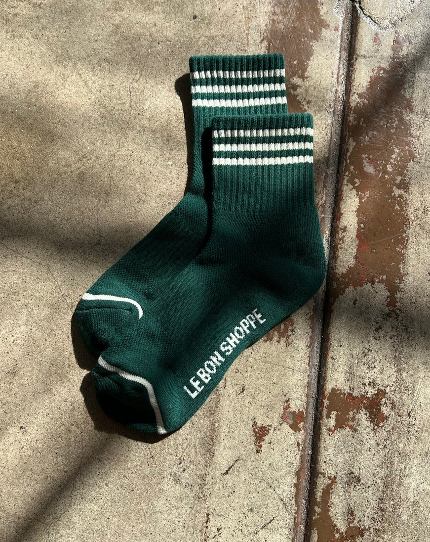They loved their Boyfriend Socks so much they decided she needed a sister. The Girlfriend Socks are the cool crew version of their original bestseller and classic Boyfriend Socks. These beauties feature a triple contrast stripe at the opening and a shorter classic crew sock length. She is a universally quintessential sock and especially flattering for petite folk.