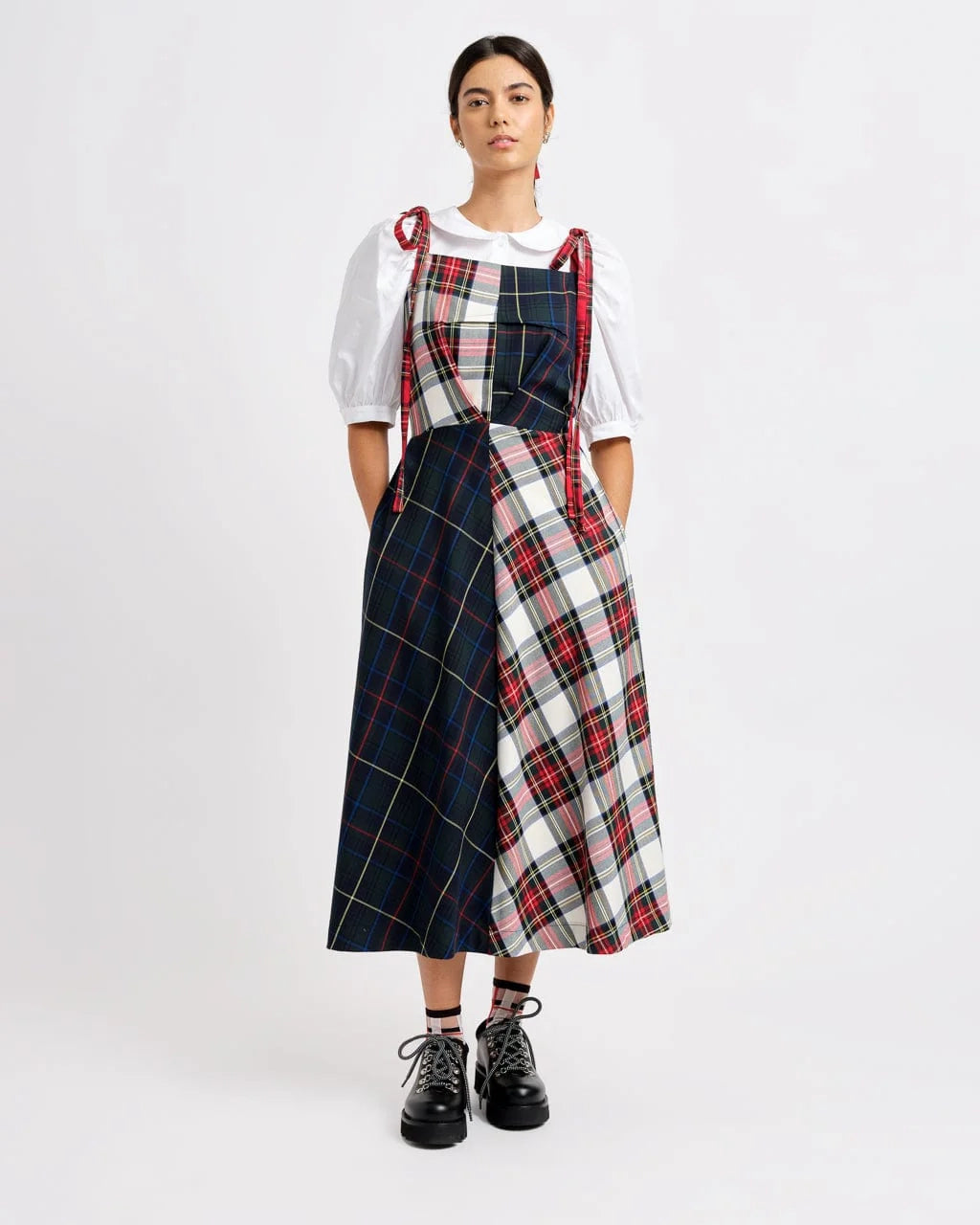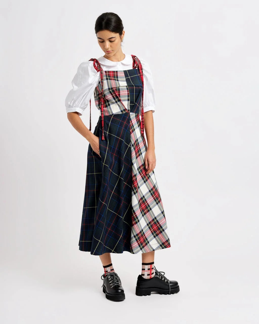 The plaid Half-Half dress is timeless classic that will never go out of style. Crafted from a luxurious blend of navy and white tartan plaid, this sophisticated a-line dress has pockets, adjustable red plaid ties, and is perfect for layering up over blouses, tees, and turtlenecks for year-round versatility.