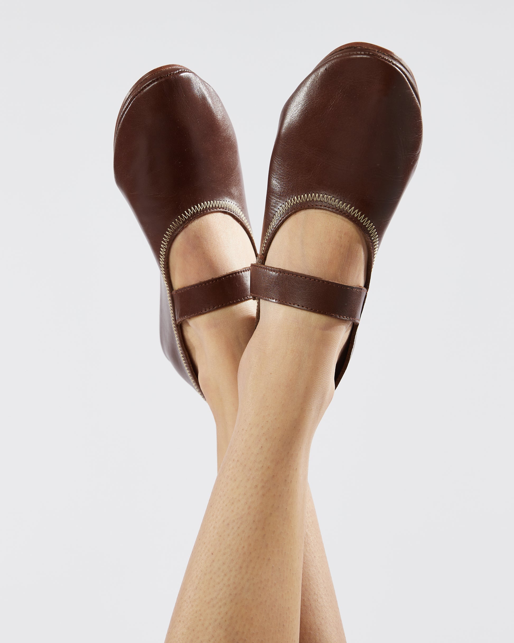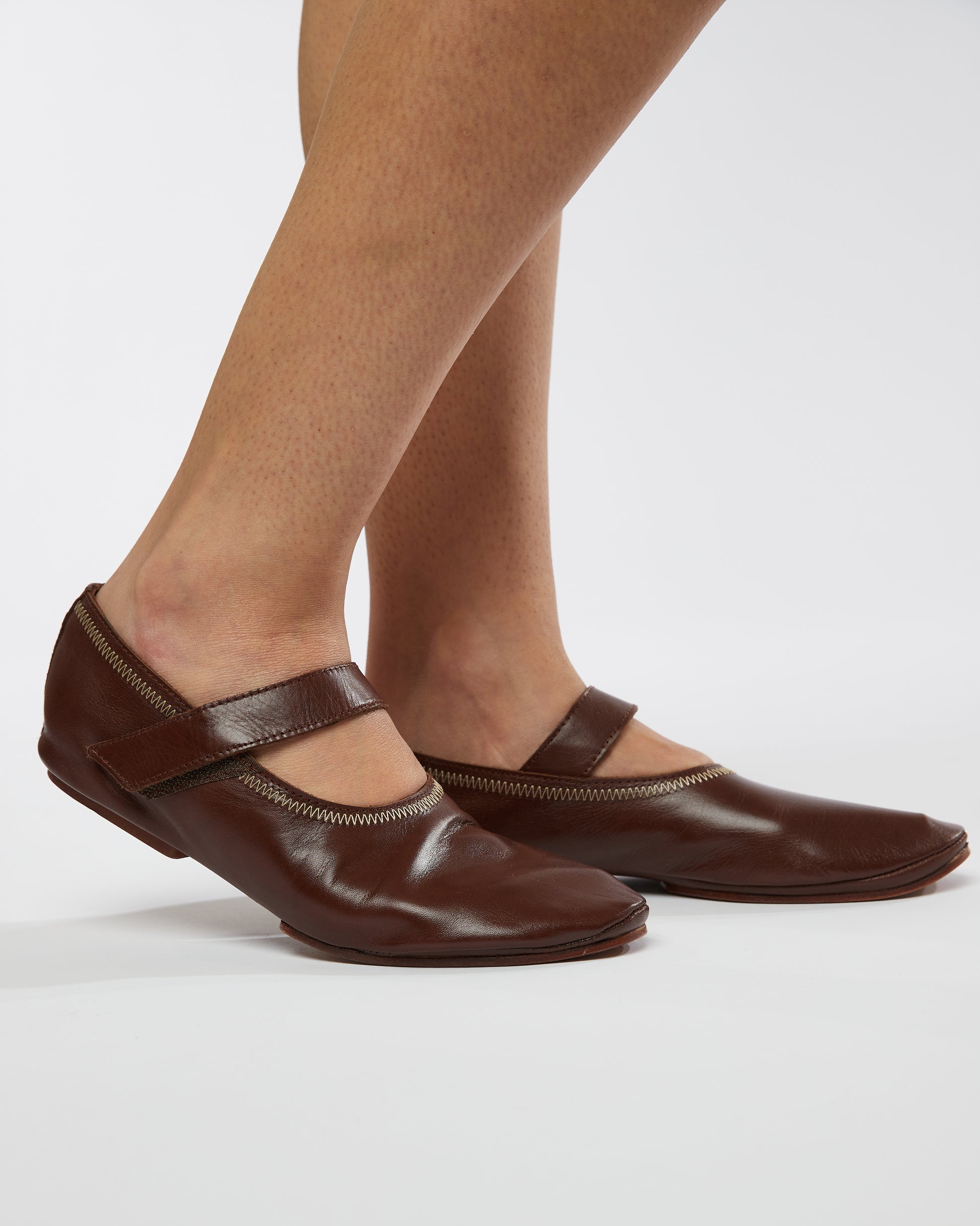 Unlined flat mary-jane made of dark brown lamb nappa leather with a shiny finish and stitching details. This ballerina inspired shoe features a rounded toe and a strap with a velcro to make the fastening invisible and to keep the lines clean and simple. The sole is made in leather and is split in two with a stitching detail in black, adding to the ballerina look.