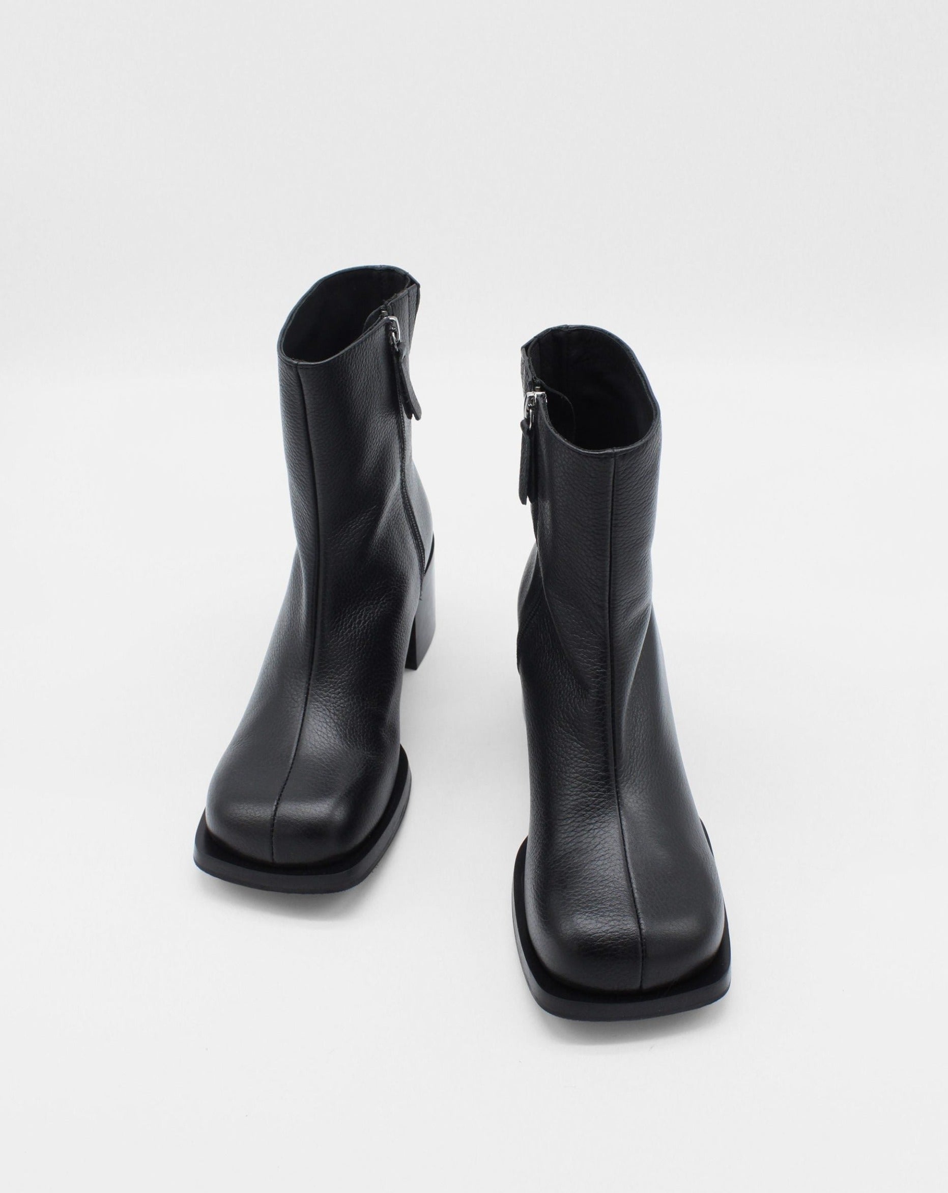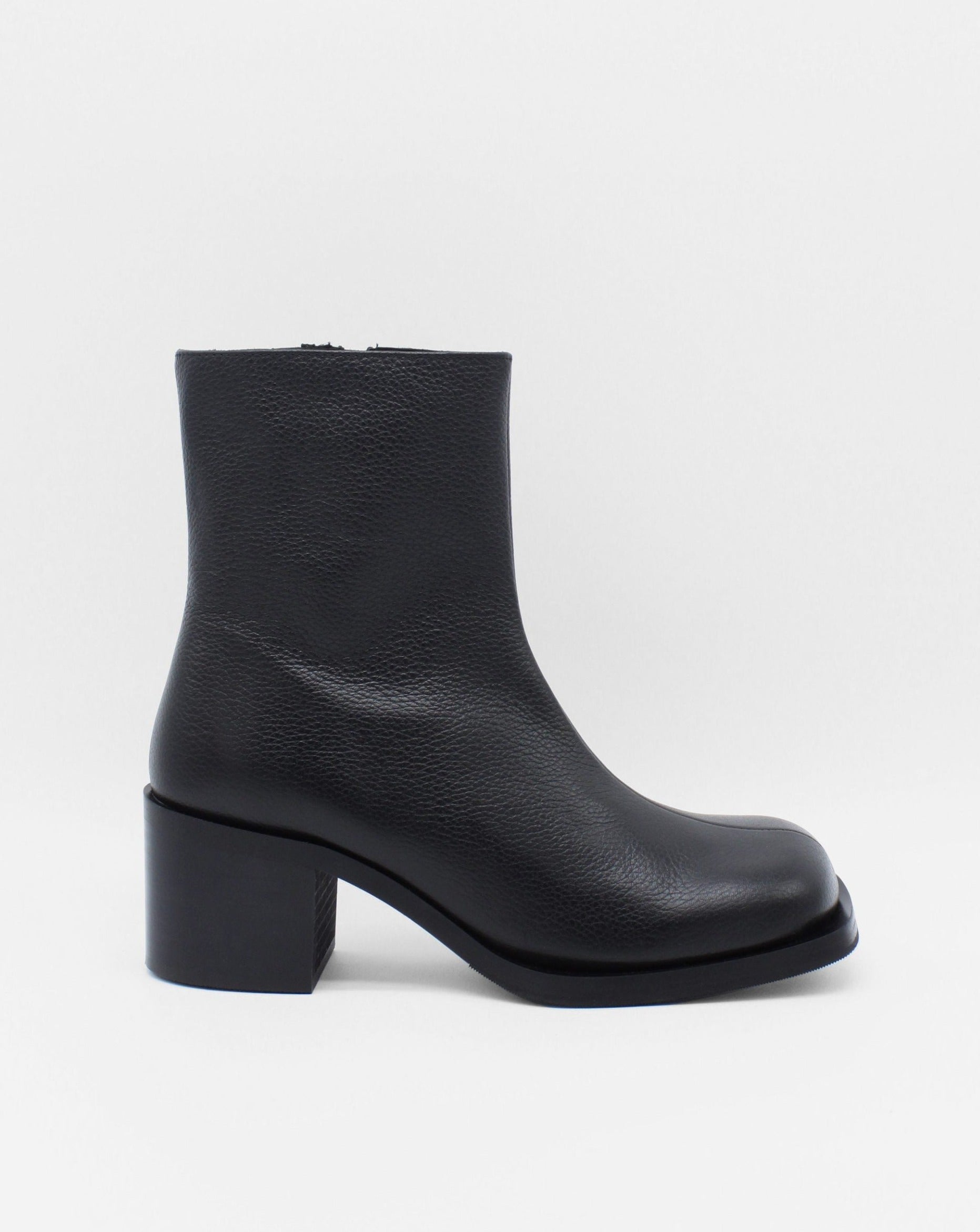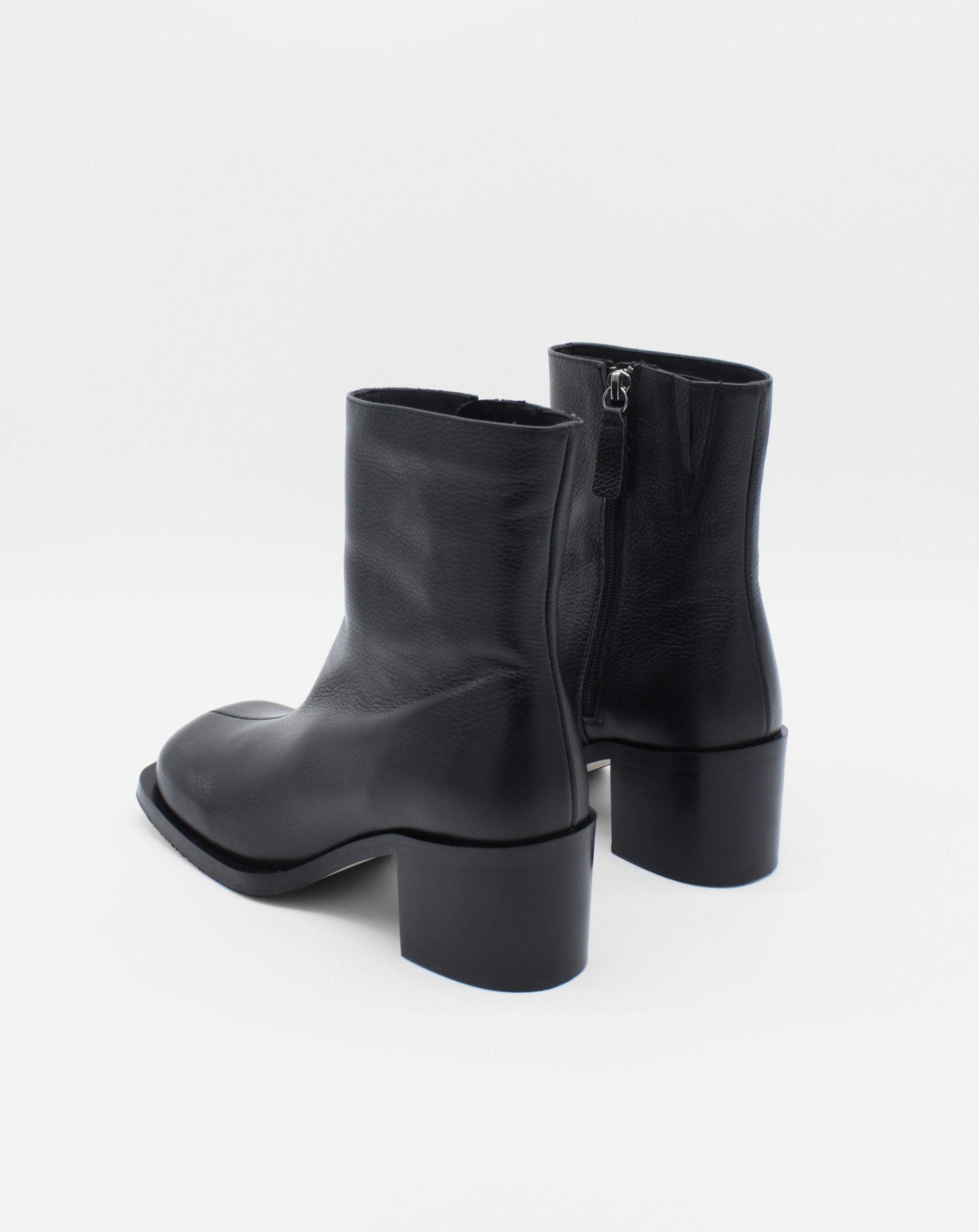 Heeled ankle boots made of black tumbled calf leather. These boots feature a chunky wood effect heel a rounded toe and an inside zipper.
