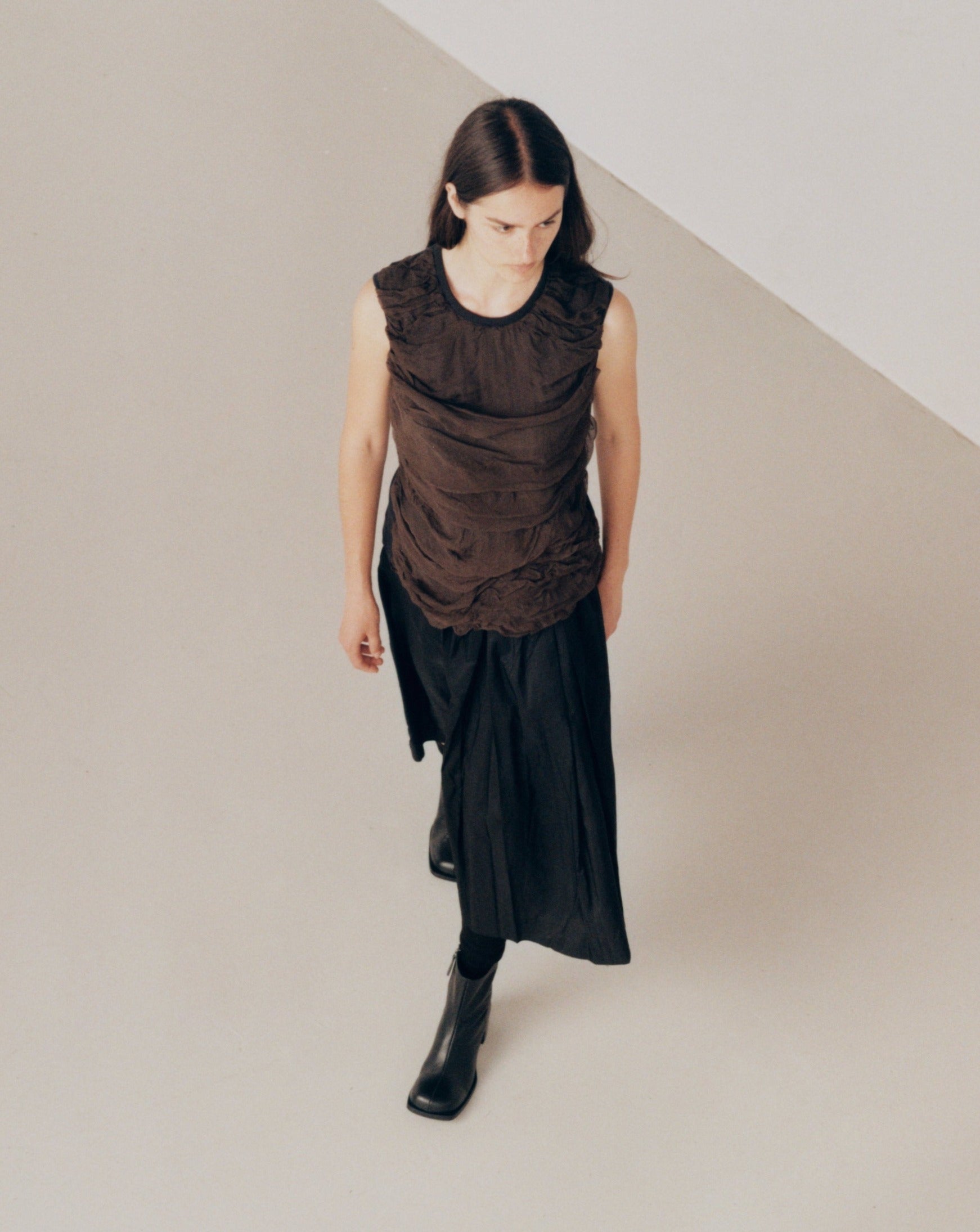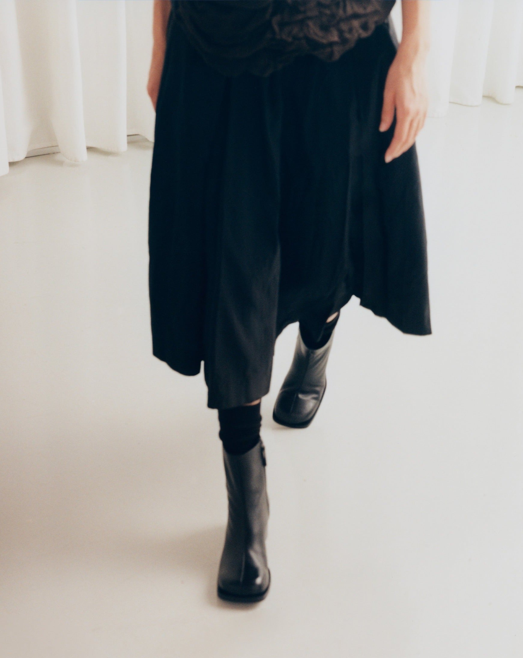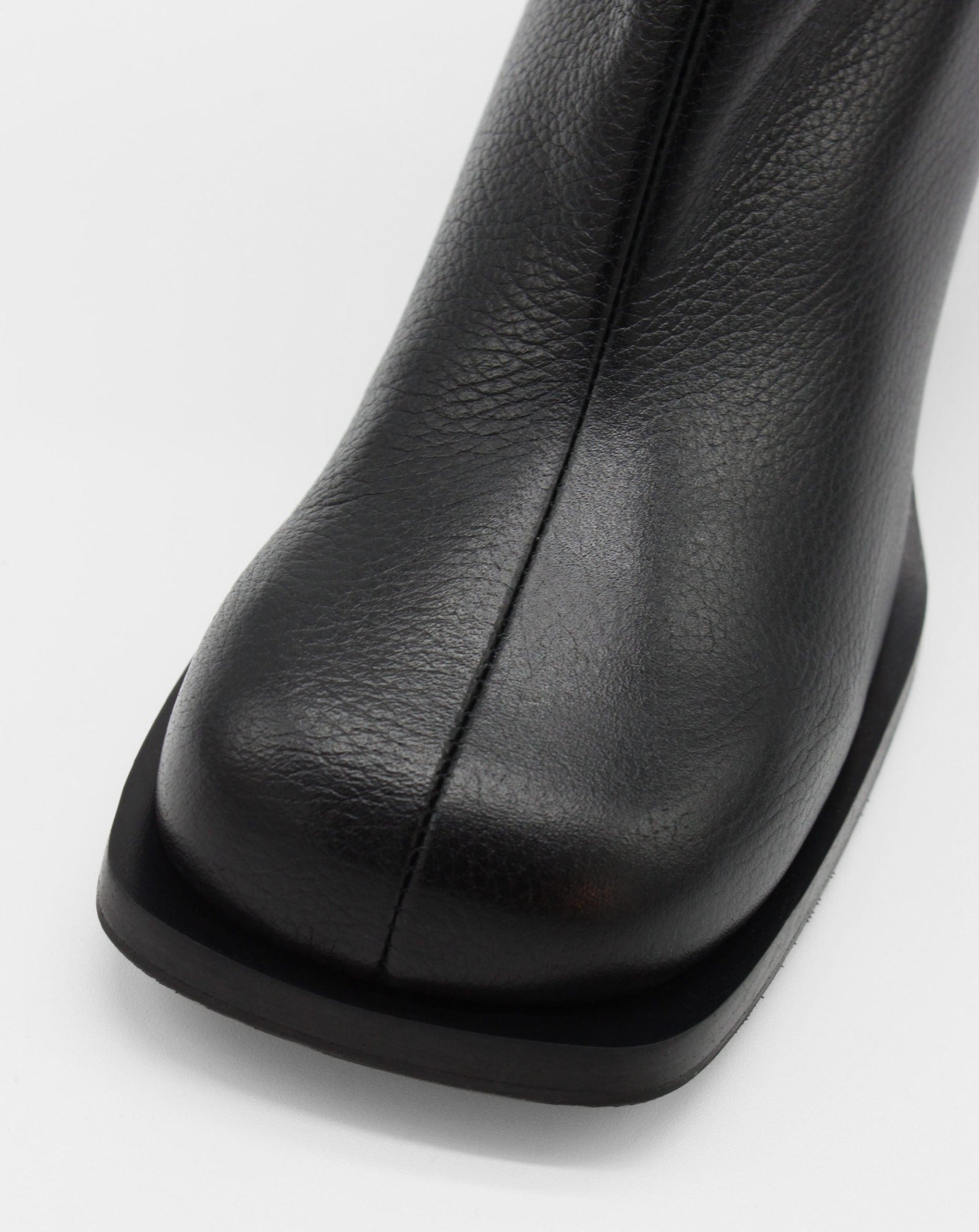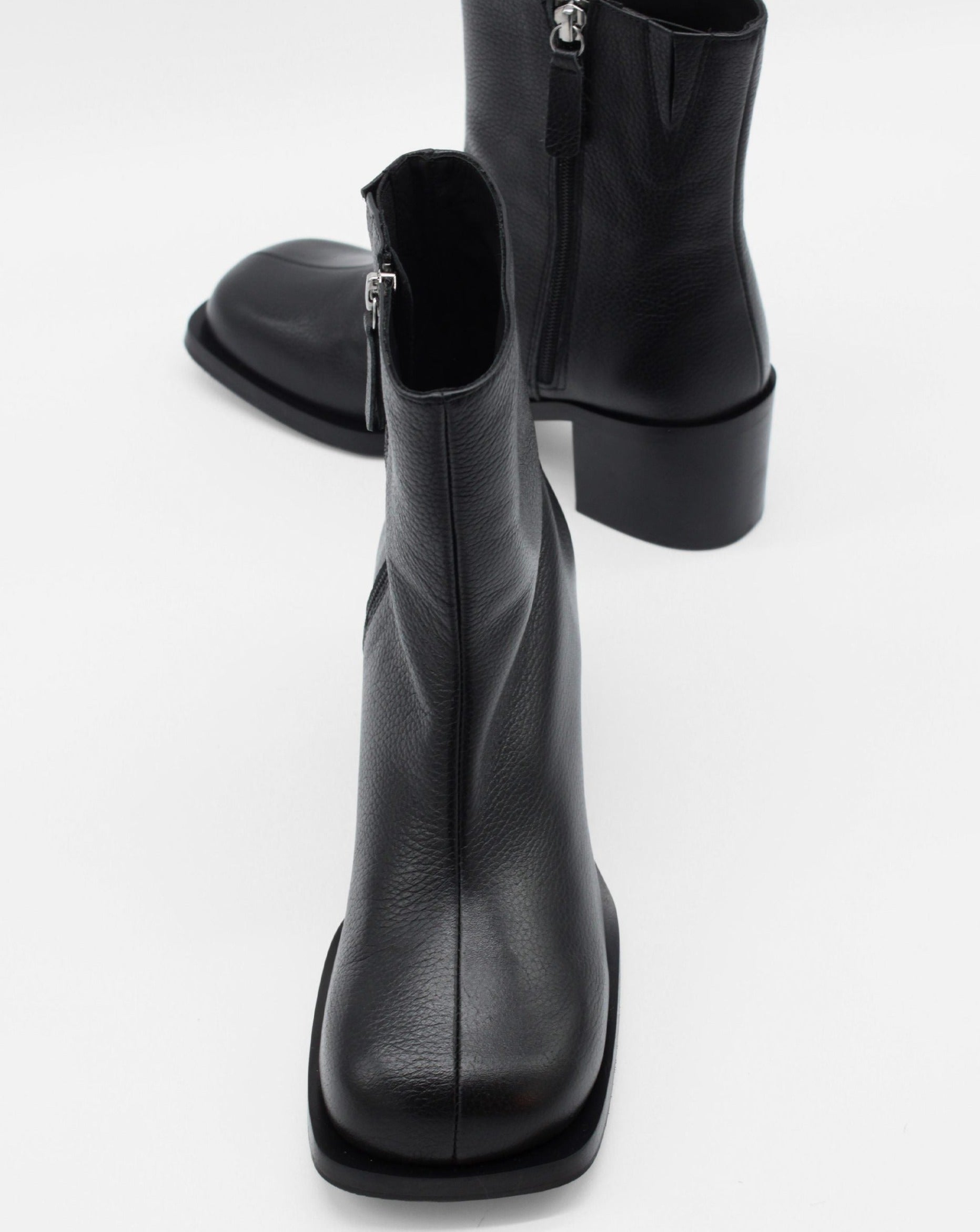 Heeled ankle boots made of black tumbled calf leather. These boots feature a chunky wood effect heel a rounded toe and an inside zipper.