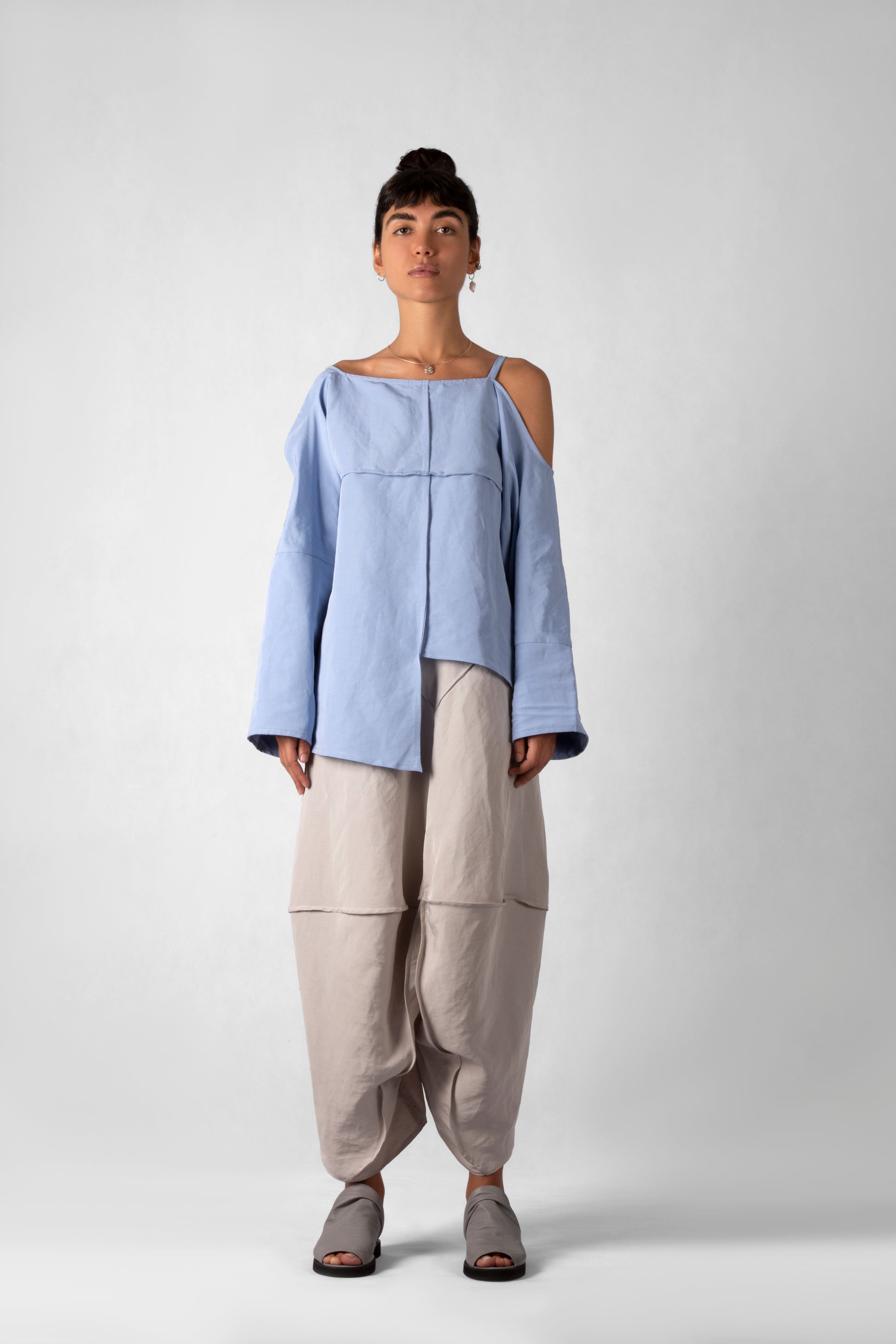 The Oversized Shirt captures the essence of relaxed elegance, combining comfort and sophistication with its wide, boxy silhouette. Crafted from soft linen in a serene shade of blue, this piece features unique buttoned details on the sleeves and a detachable scarf that can be styled in multiple ways. Its minimalist design allows for versatile styling, whether worn casually or dressed up. A perfect blend of modern fashion and timeless comfort,
