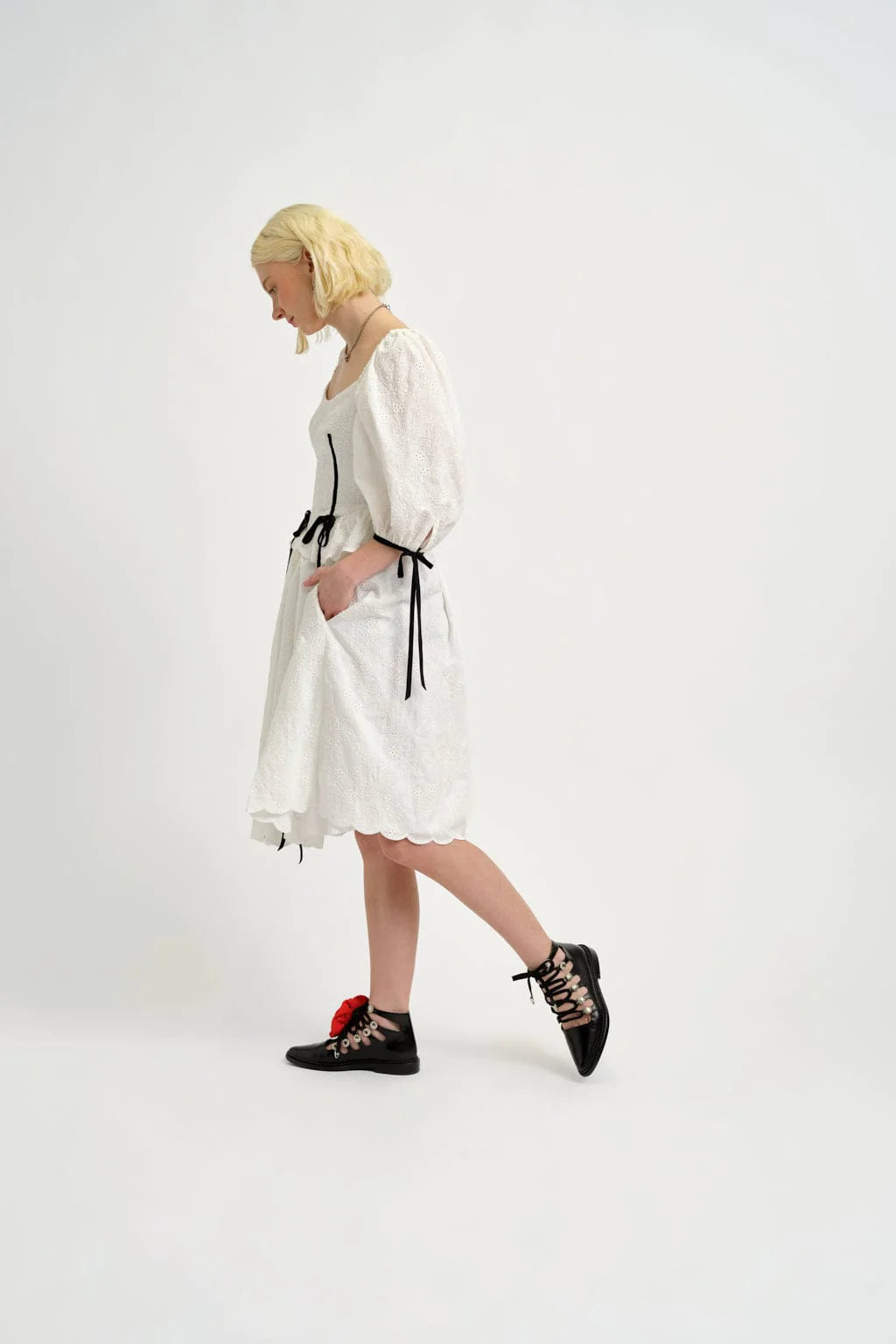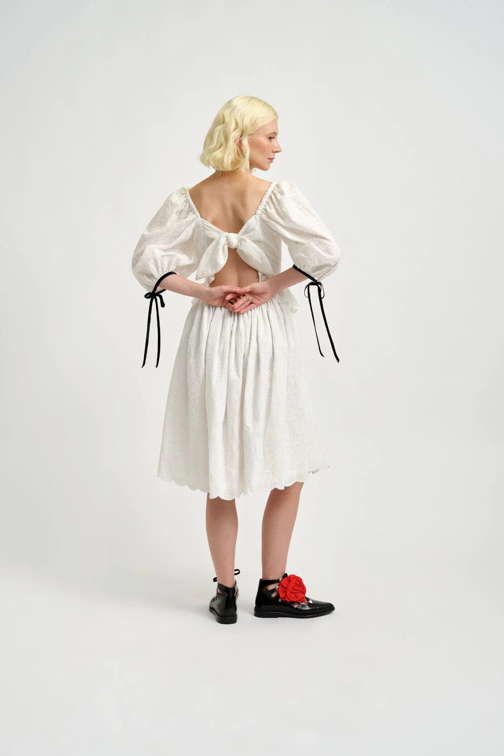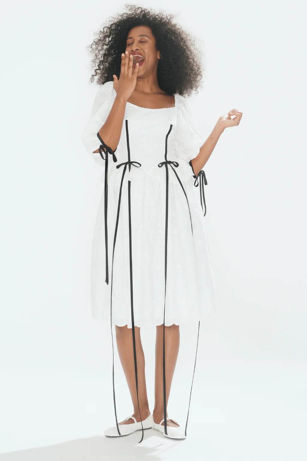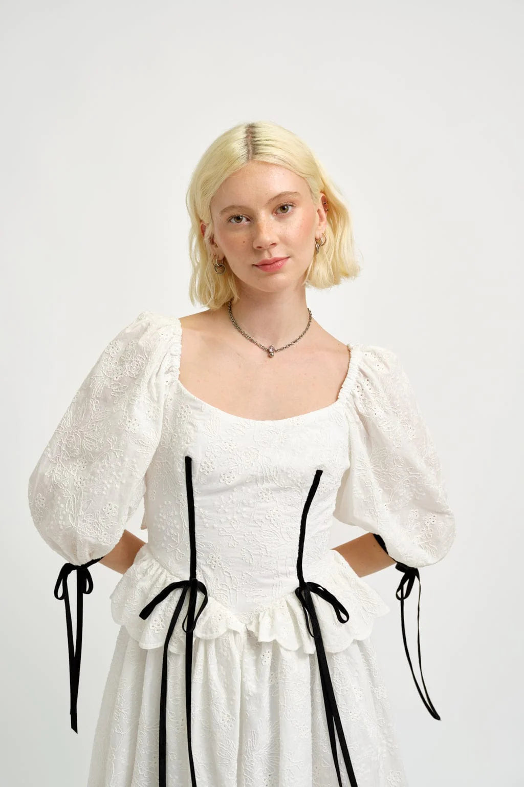 This white eyelet dress features puff sleeves and a voluptuous tiered skirt with scallop edges. The bodice is basque shaped and has a scalloped peplum frill. An elastic waist and bow tie back add both style and comfort. Black velvet ribbon adorn the front corset and the sleeve ties for a touch of whimsy.