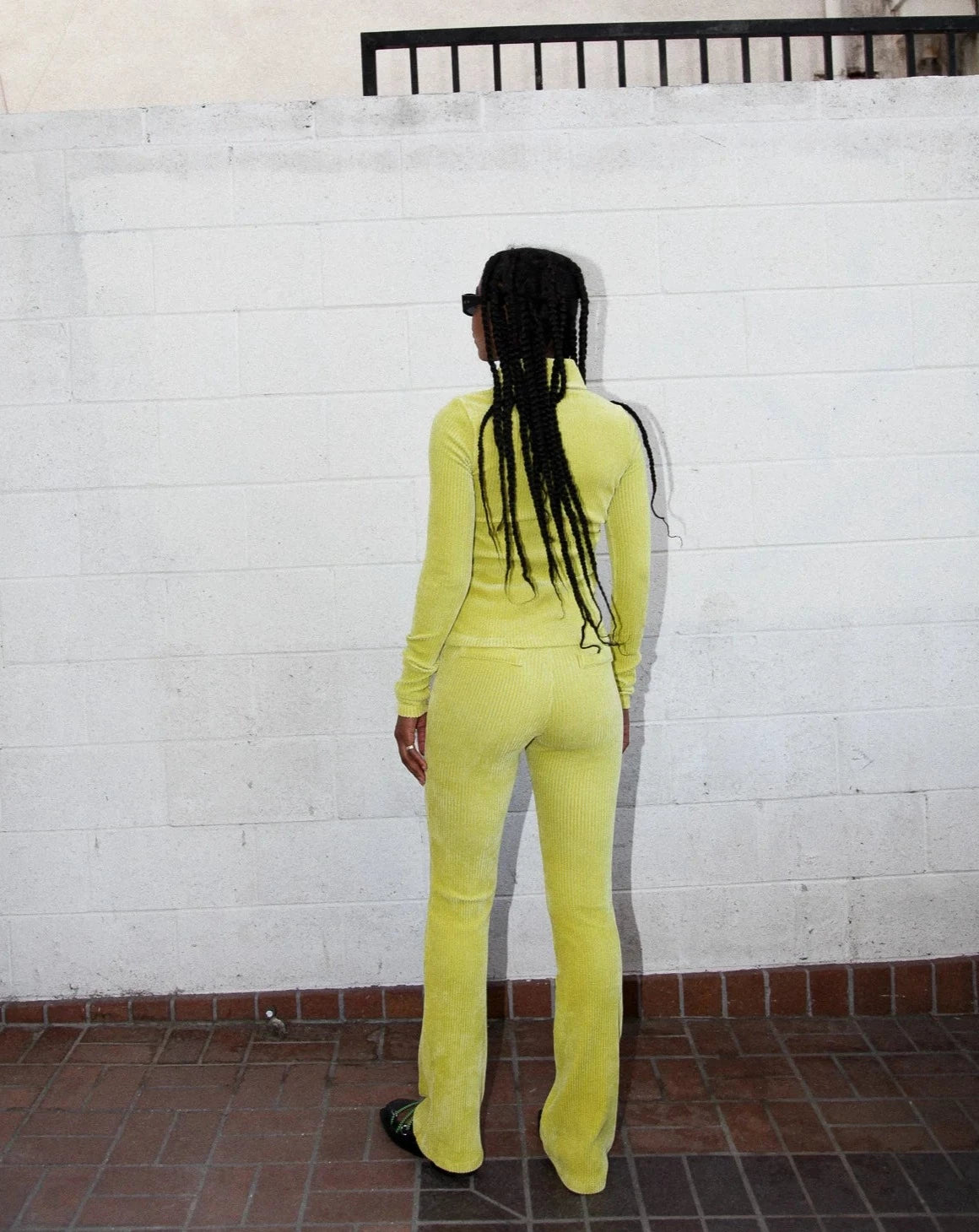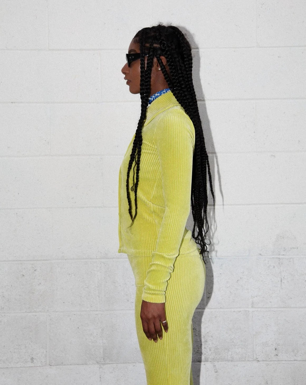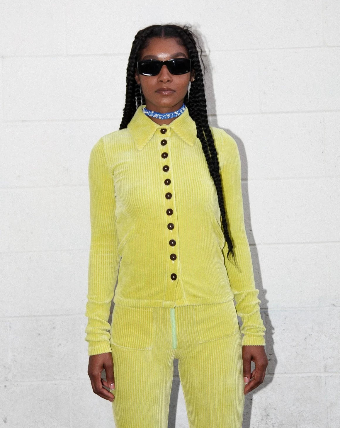 Made in Los Angeles with cotton/modal velour rib. Lucite Buttons.