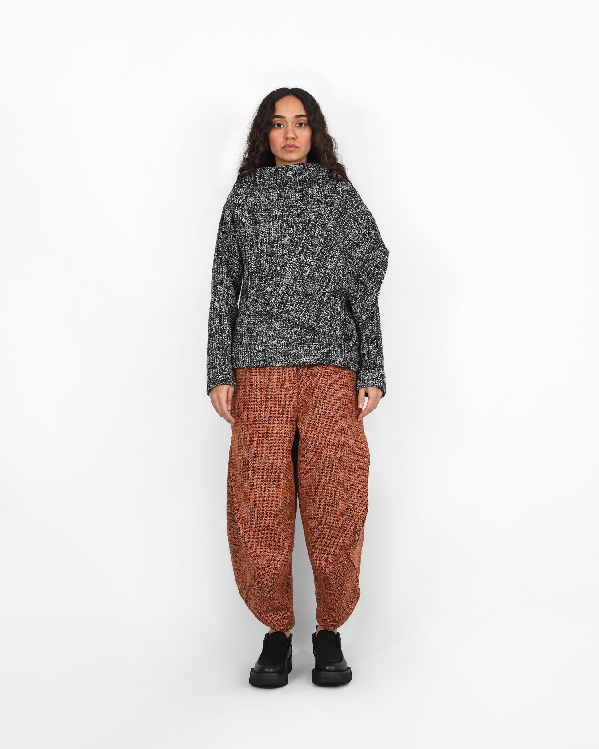 This top plays with the balance of geometric shapes and fluidity. This unique piece features diagonal lines and angles that break the norm, creating an intriguing visual effect. The design highlights the movement and depth within the fabric while maintaining a minimalist aesthetic. Its boxy fit and the structured fabric bring a fresh take on contemporary fashion.
