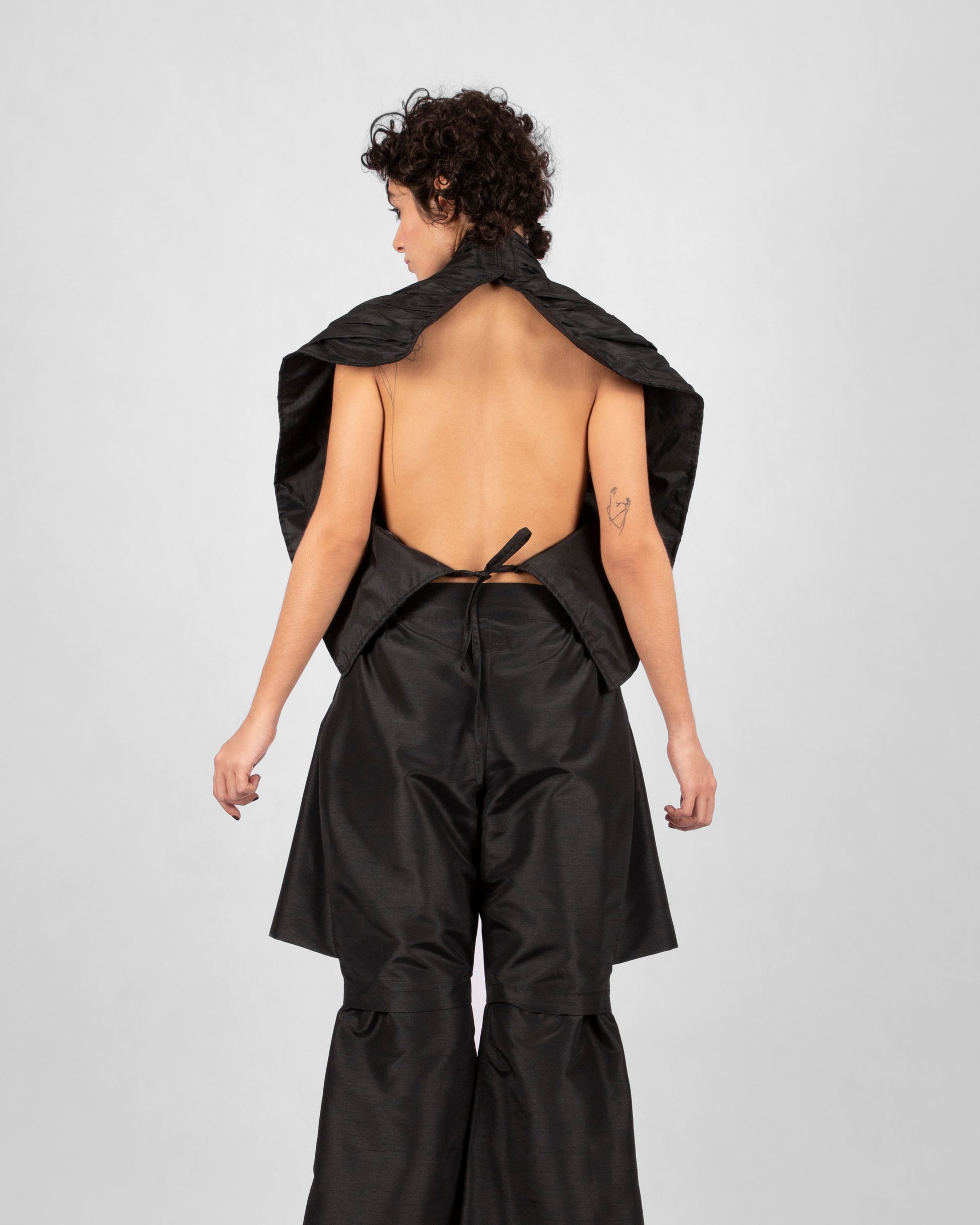 This top-vest captures the essence of dynamic movement and architectural volume through its structured pleats and sculptural shape. The layered fabric forms dramatic folds that convey a sense of energy, as if the garment is in constant motion. Its backless design adds an element of boldness, while the gathered fabric at the front creates a sense of volume and depth. it's a bold, modern statement piece that plays with form and texture, offering a striking and sophisticated look.