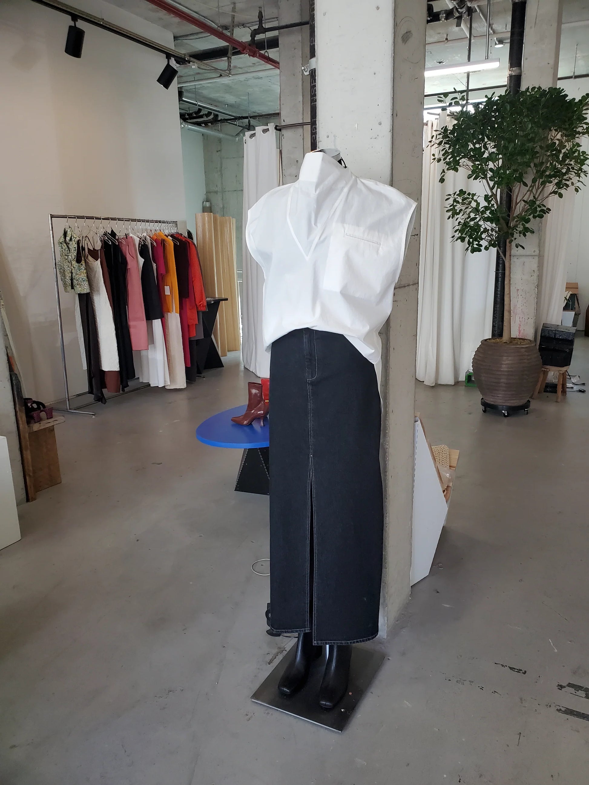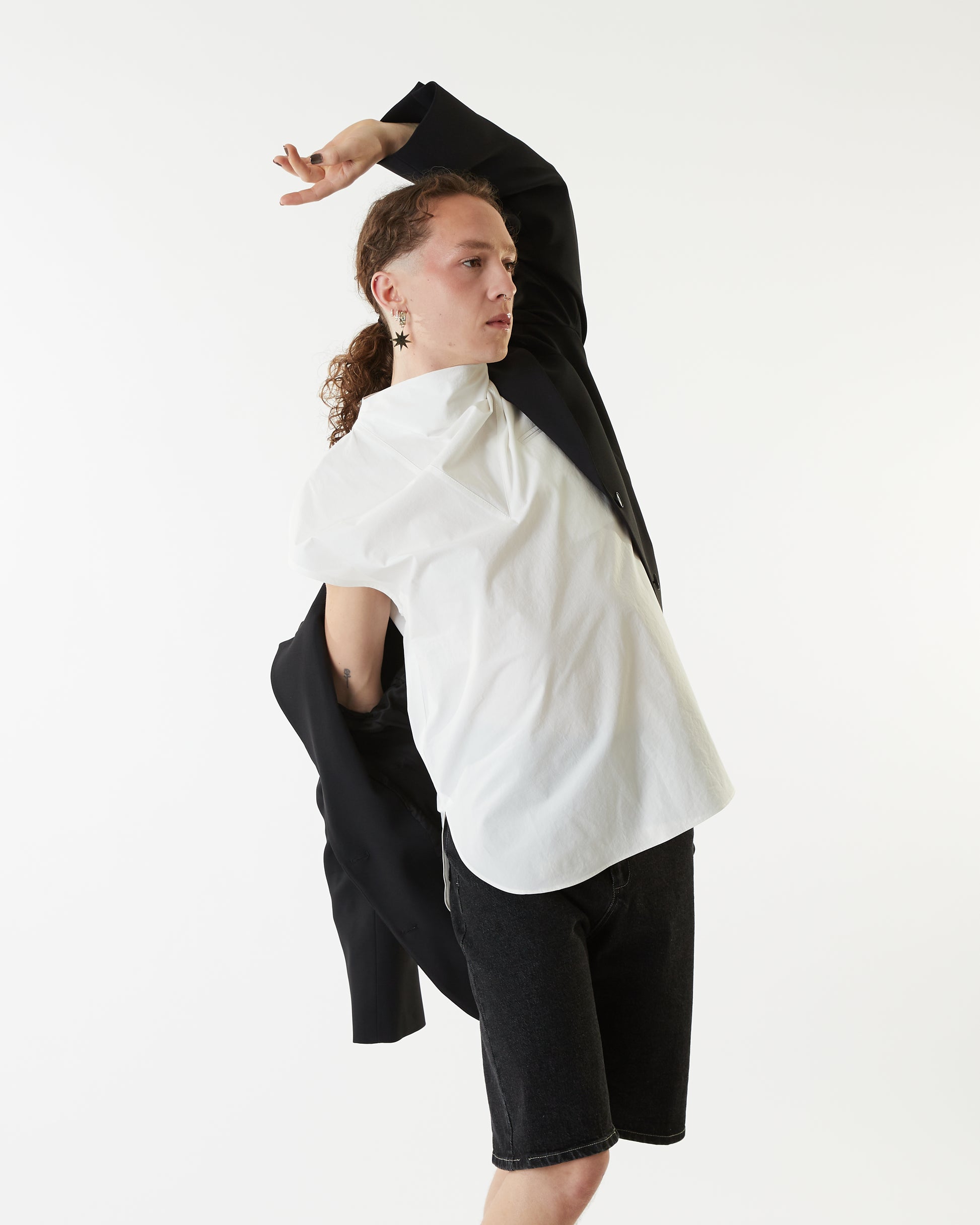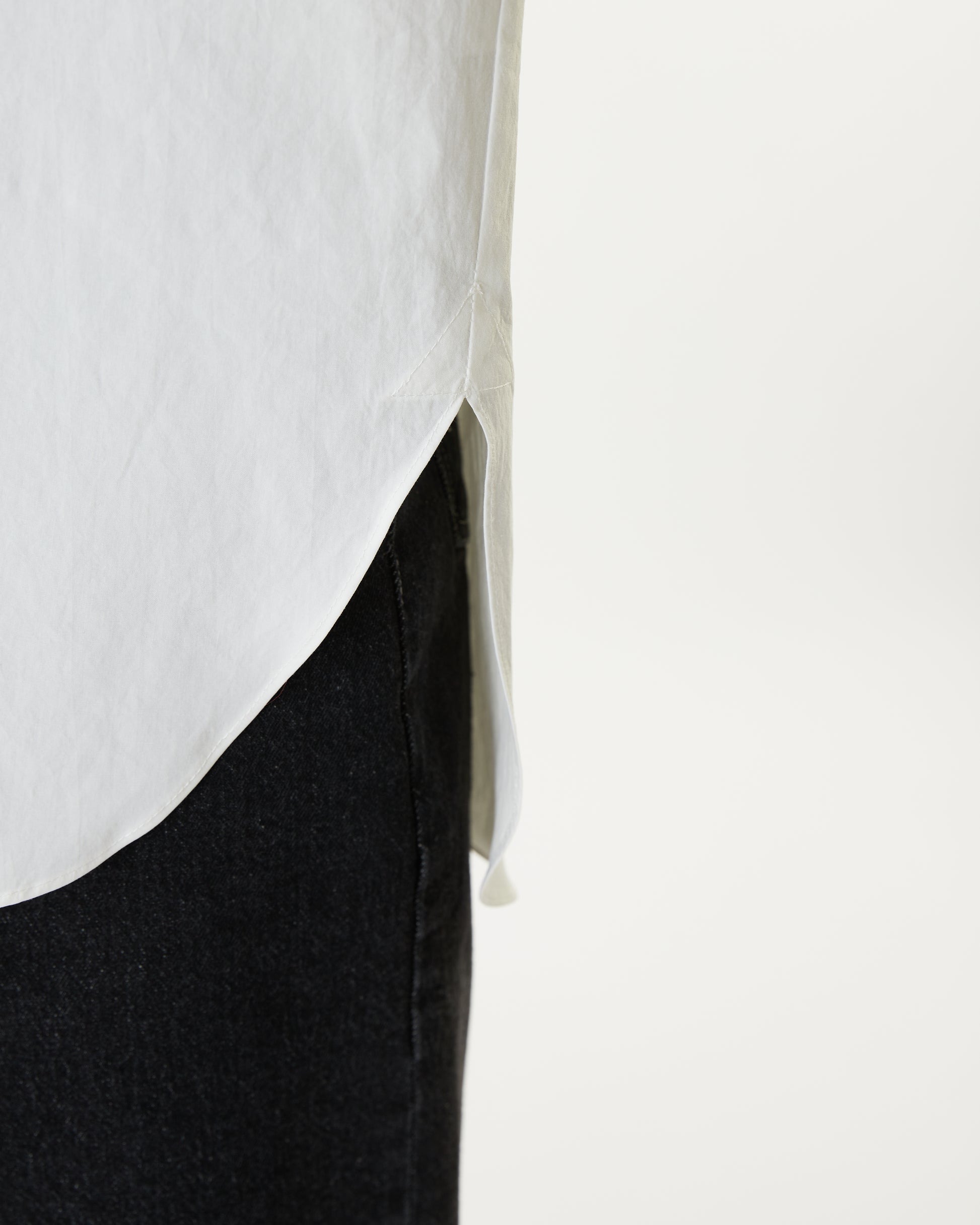 Oversize sleeveless top with "anorak" style funnel neck detail in washed white cotton. Invisible zipper in center back. Rounded hem in front with longer rounded hem in back