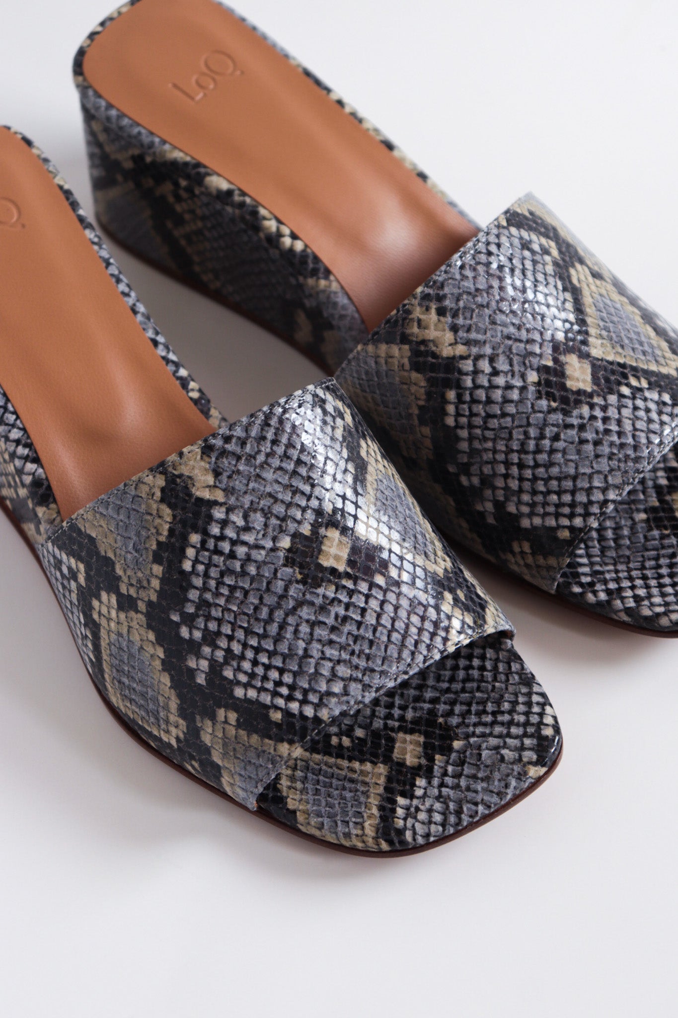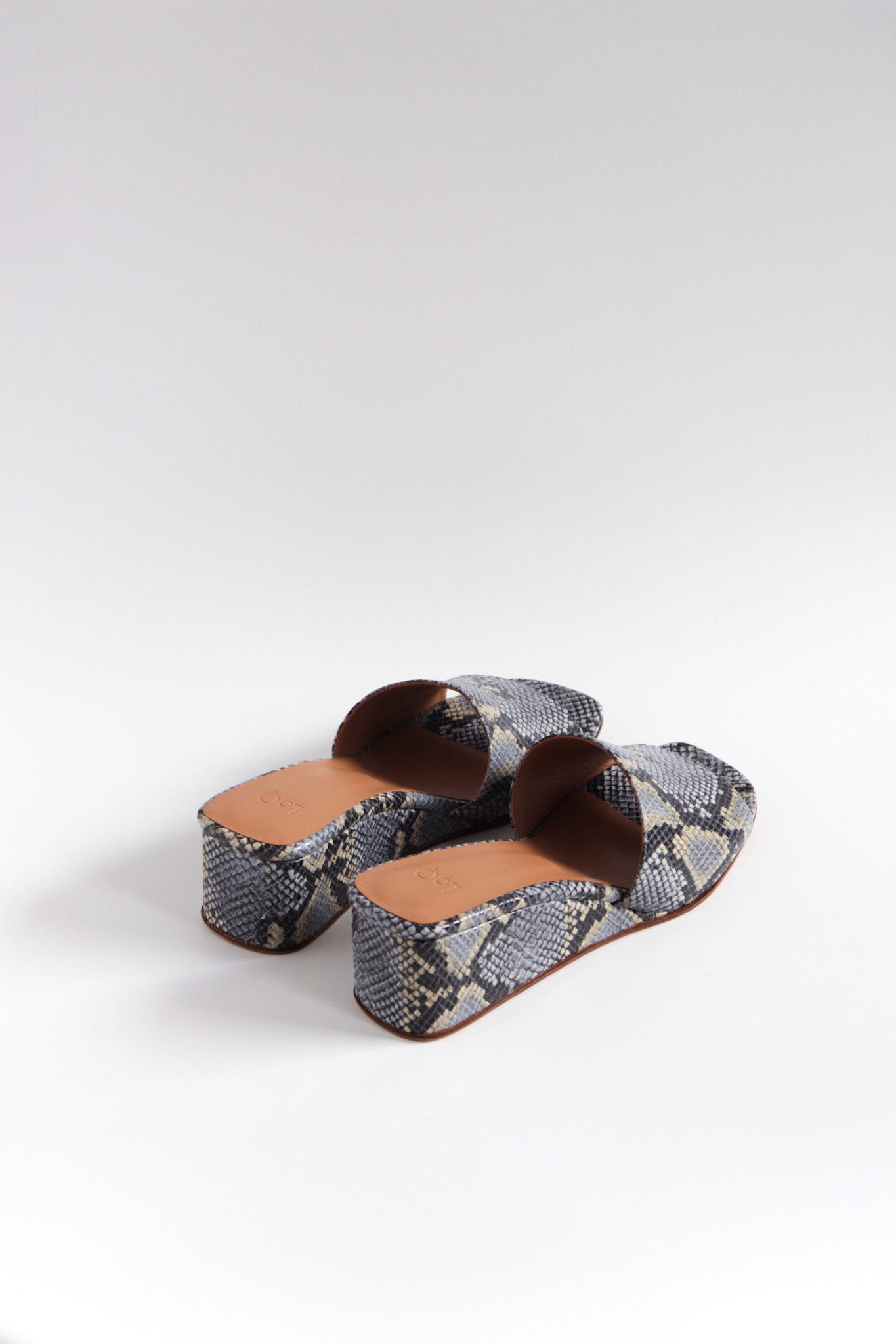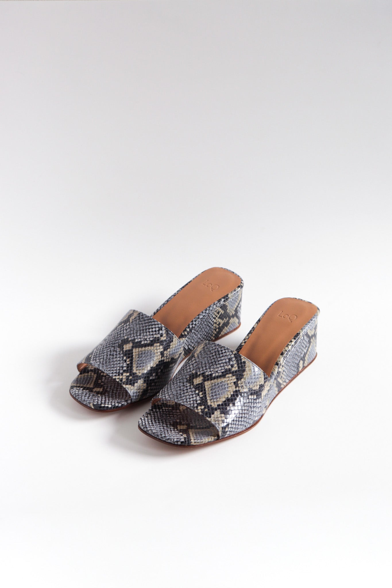 The Sol is a wedge sandal wrapped in blue snakeskin motif leather. 2" patent covered heel. Padded leather footbed and leather sole. Fits true to size. Made in Spain.