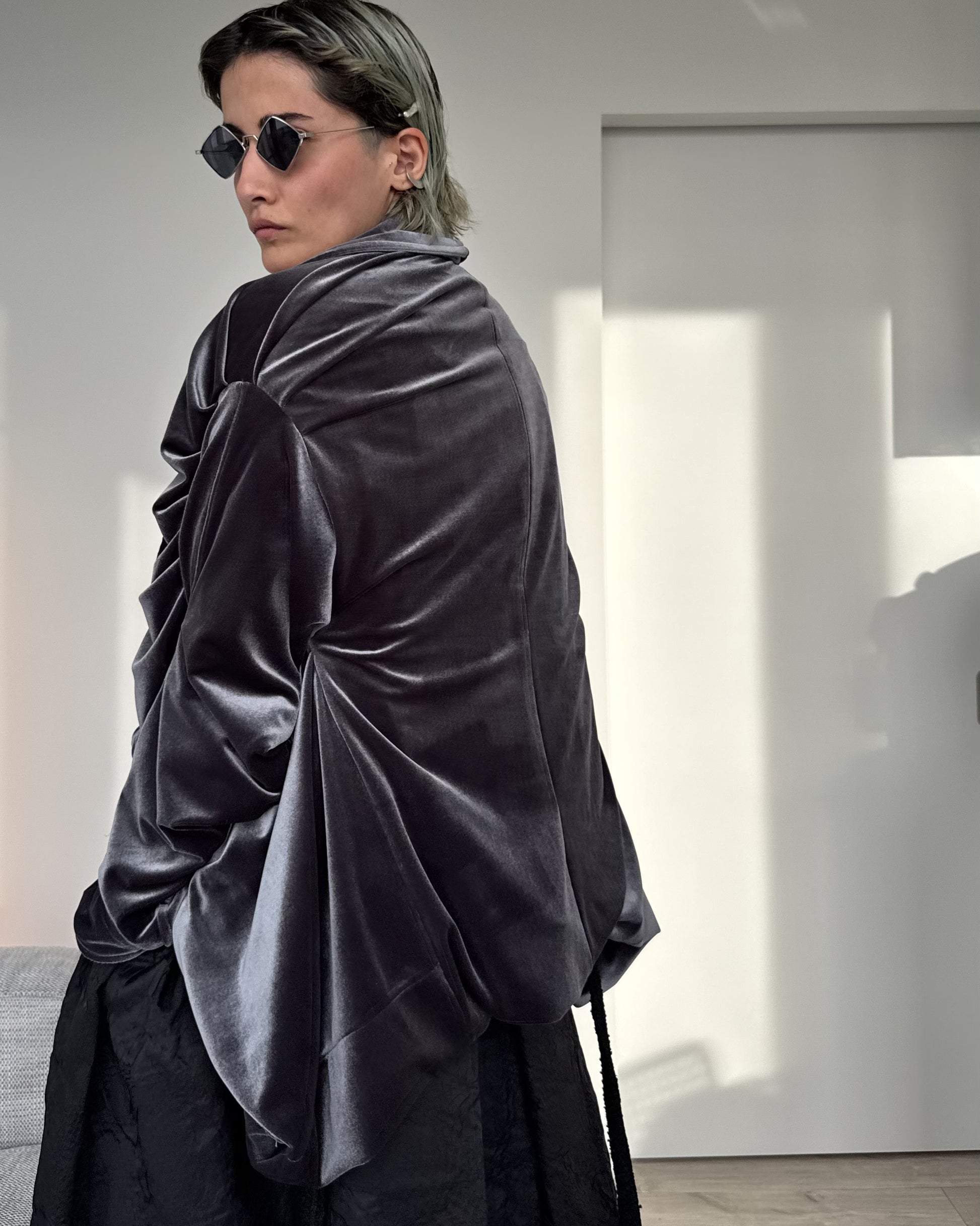 The "Spiral Drape" coat is an exquisite fusion of fluid drapery and dynamic twists, creating a harmonious balance between structure and movement. Carefully crafted from luxurious fabric, the coat features intricate twists that spiral through the design, adding both volume and visual intrigue. The flowing drapery contrasts beautifully with the sculptural twists, allowing the garment to flow gracefully while maintaining a bold, defined shape.