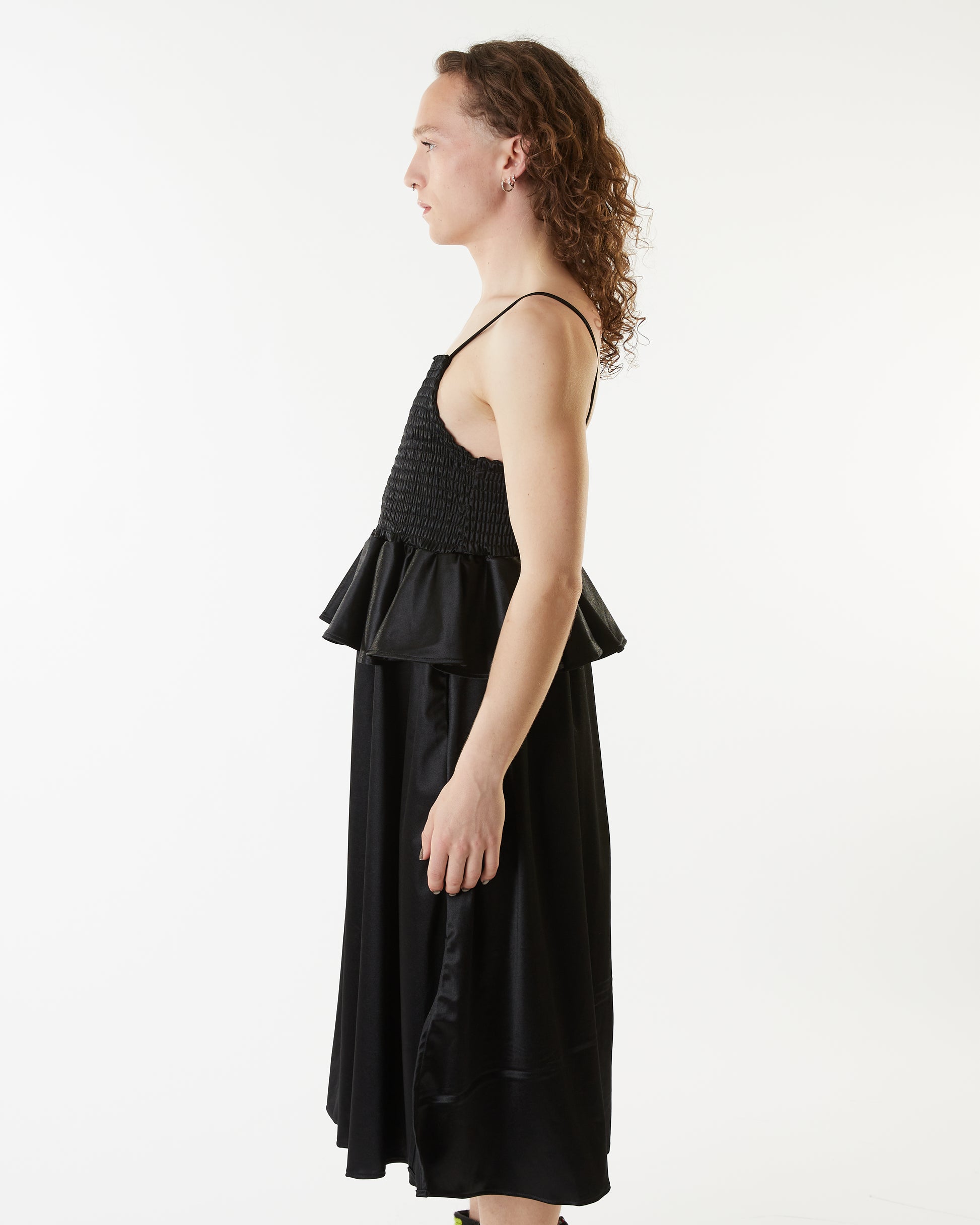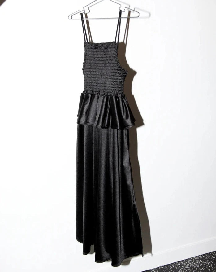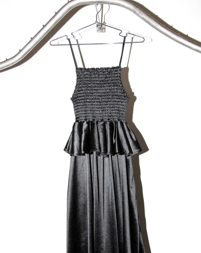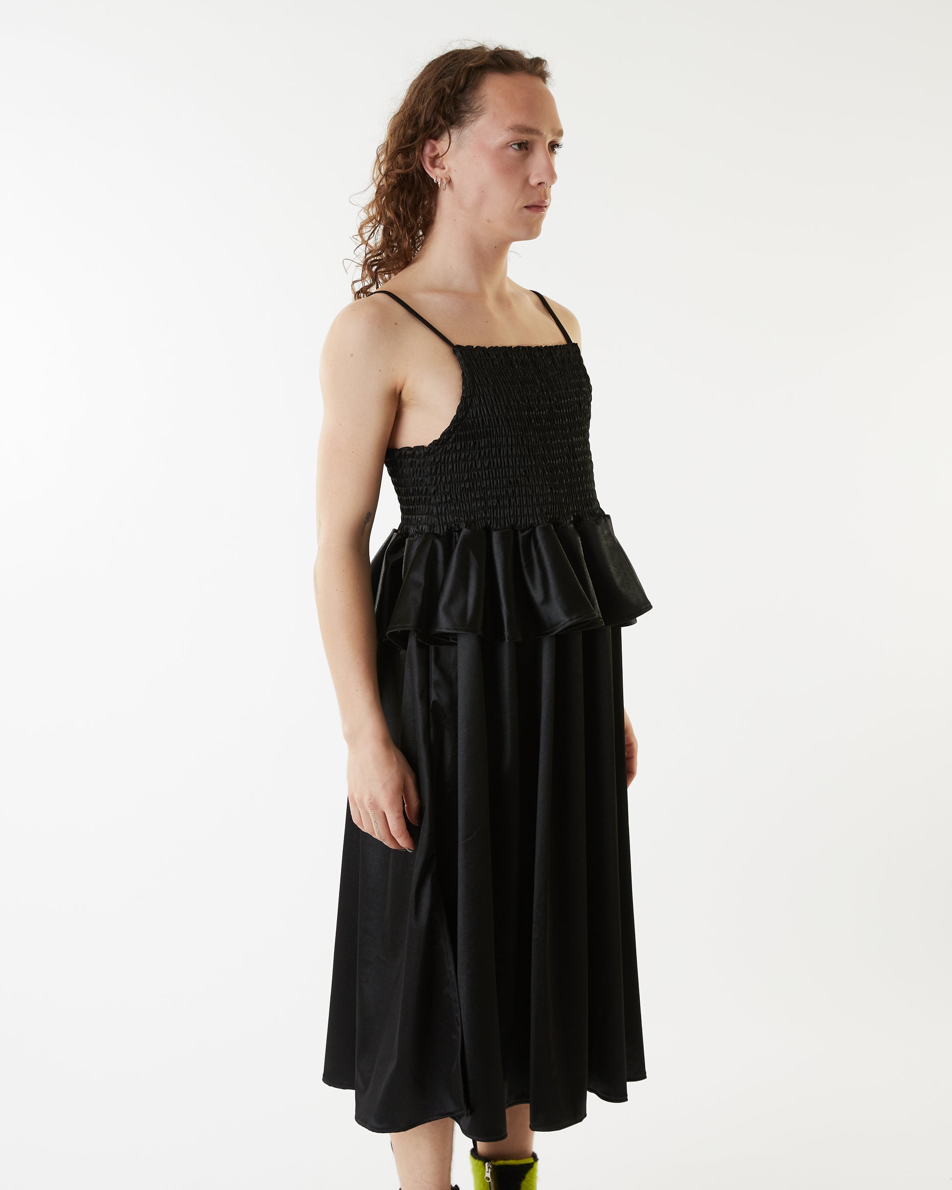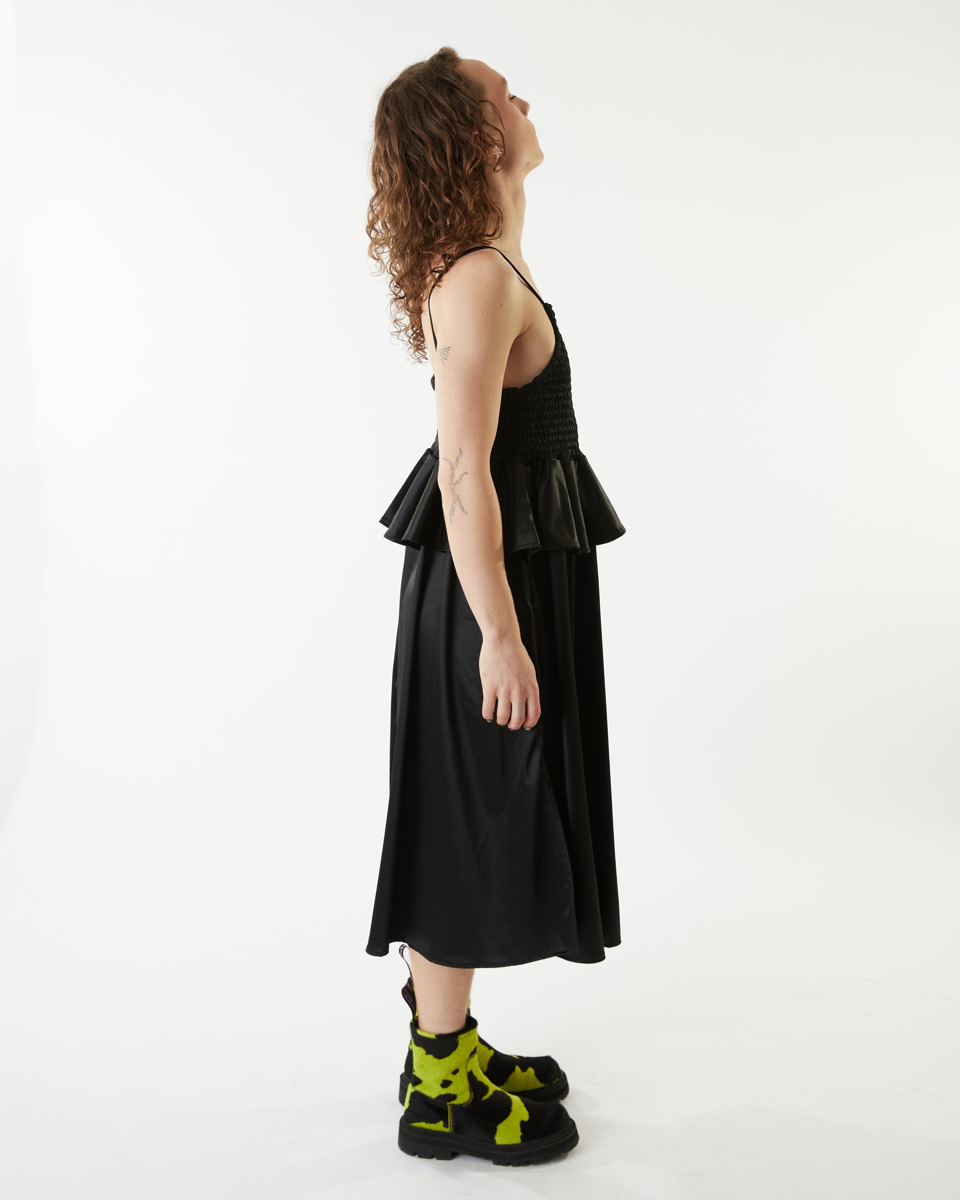 A-line dress with shirred bodice and peplum waist. Made of vintage heavyweight satin.