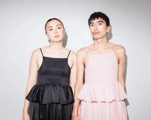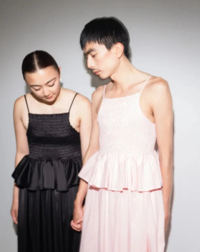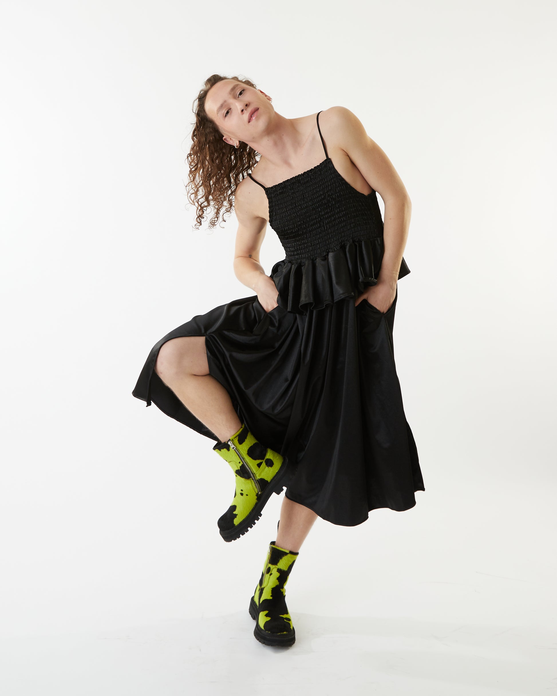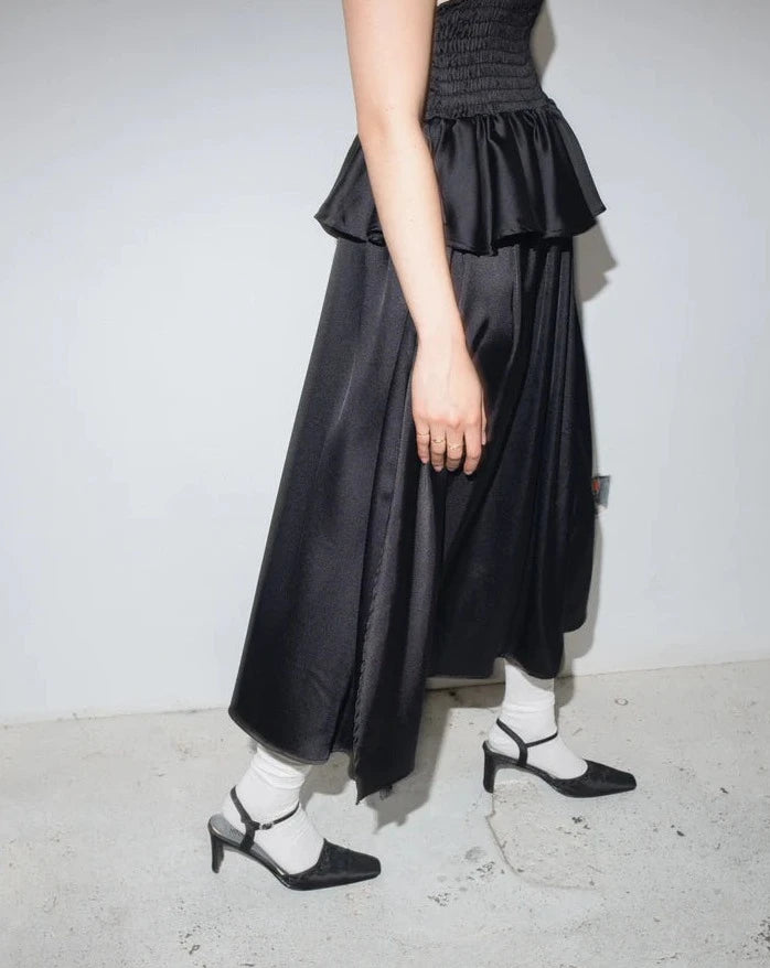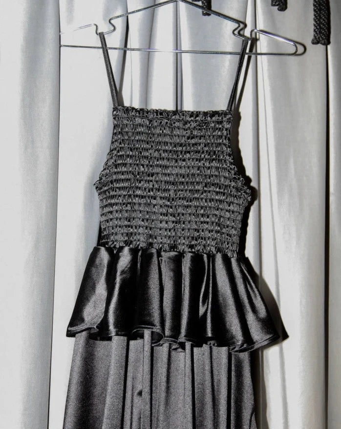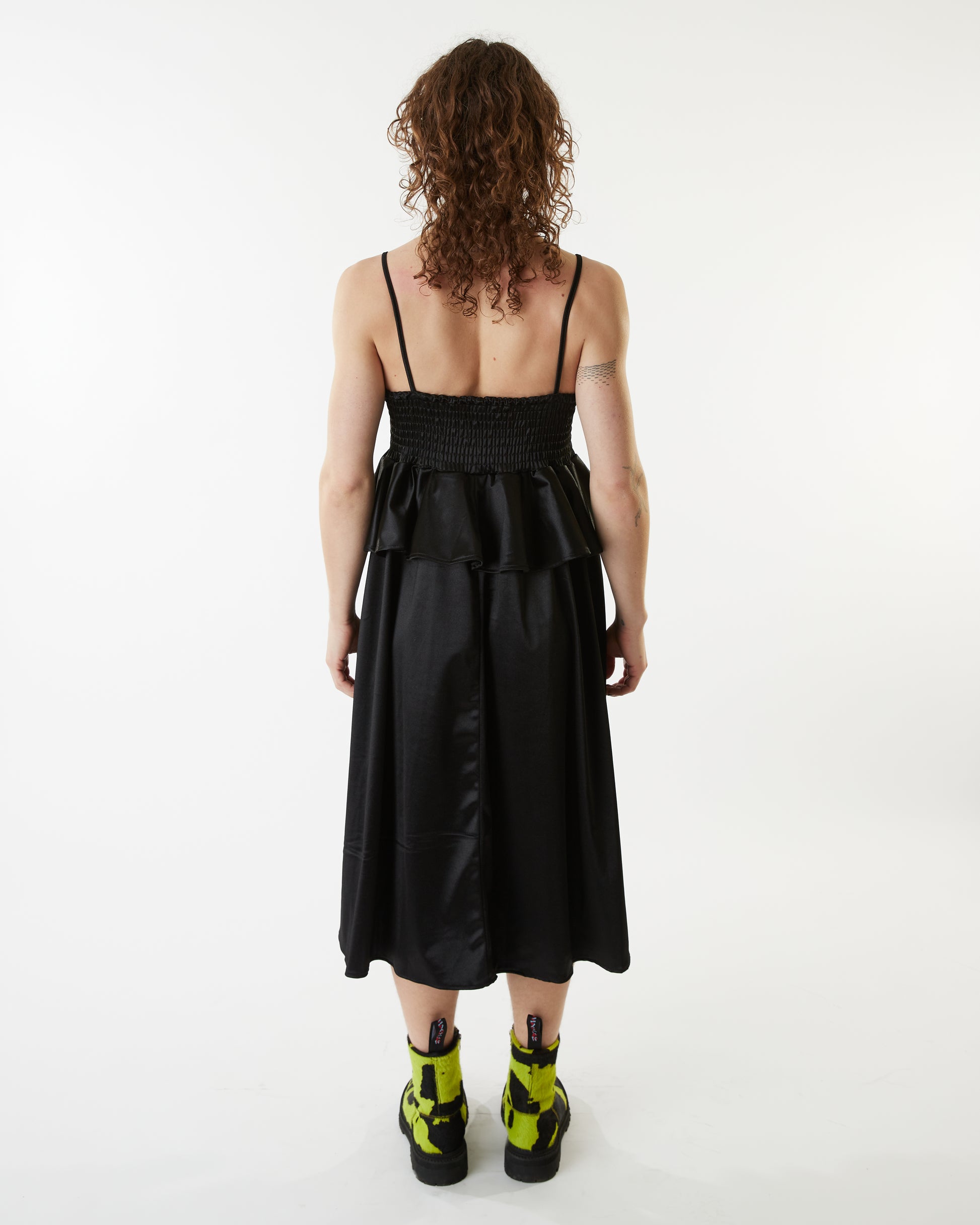A-line dress with shirred bodice and peplum waist. Made of vintage heavyweight satin.